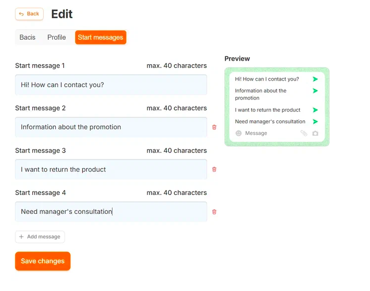 * &#x20;Set up start messages for the official WhatsApp Business API (WABA) integration so that your customers can quickly select and send you a message from the suggested list by opening your profile:&#x20;