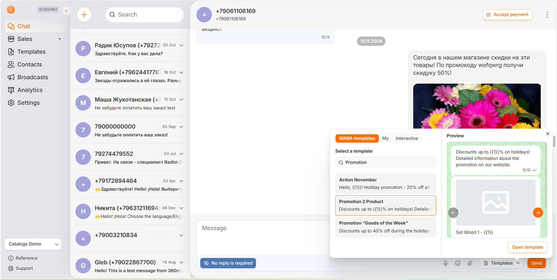 * send WhatsApp Business templates to customers and create regular message templates;&#x20;