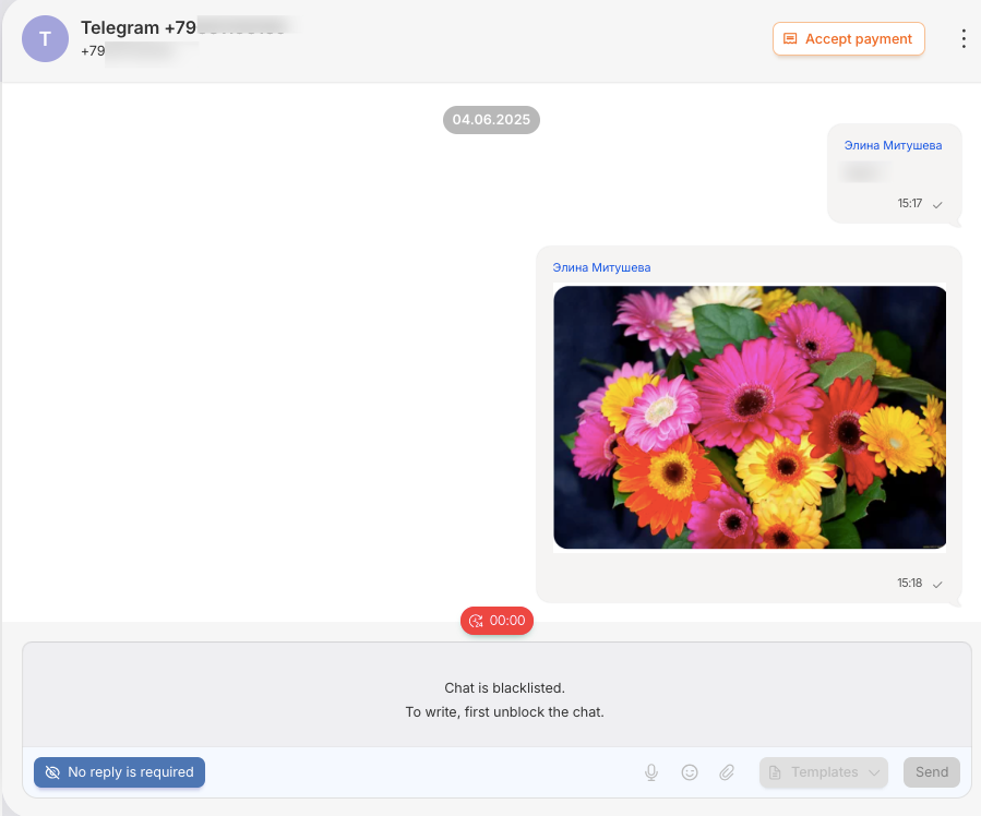 ❗️ If the message was sent from a CRM or through a mailing list, the sender's name will not be displayed in the outgoing message. Instead, only the message itself, the time of dispatch, and the delivery status will be shown.<br>