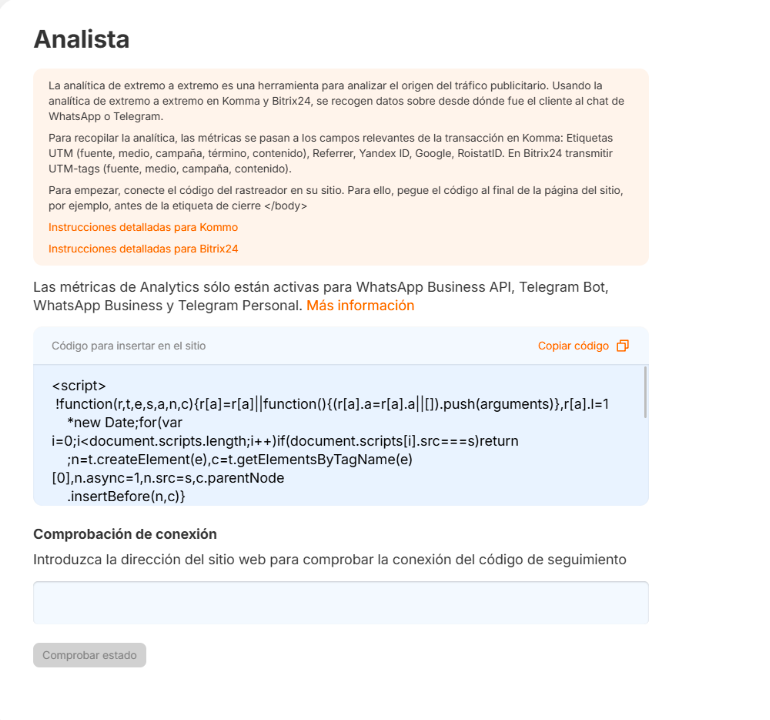 En la sección de Análisis, puede copiar el código del rastreador a través del botón "Copiar código" para conectarlo a su sitio. &#x20;