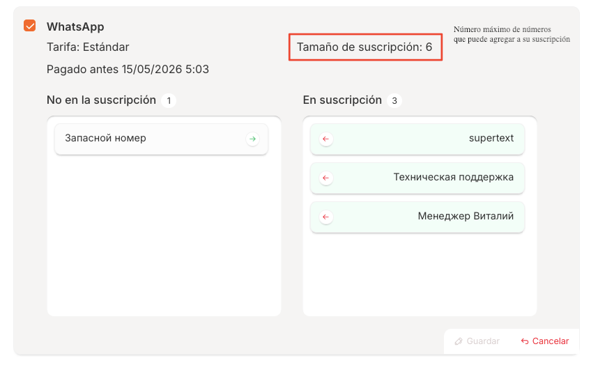 Muestra el número máximo de números que se pueden añadir a la suscripción. Puede aumentar el tamaño de la suscripción comprando más números mediante la operación «Actualizar tarifa actual» utilizando el botón «Pagar».
