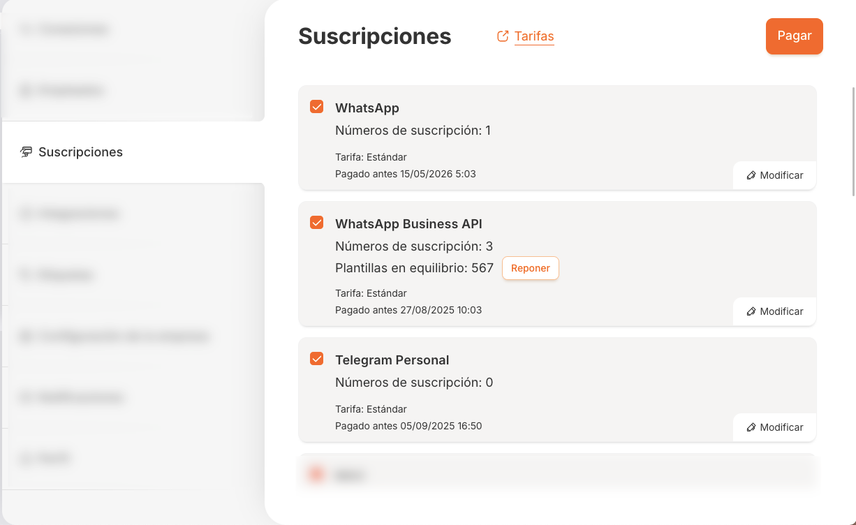 A través del botón «Recargar» de la tarjeta de suscripción de WhatsApp Business API, puede pagar para añadir conversaciones WABA a su suscripción.