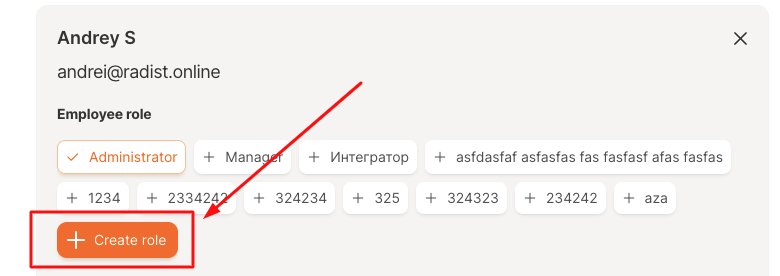 How to set up custom roles is described above in the instructions in the paragraph: "[Creating custom roles"](https://docs.radist.online/docs/v/english-2/our-products/radist-web/staff#creating-custom-fields-for-employees-in-radistweb)
