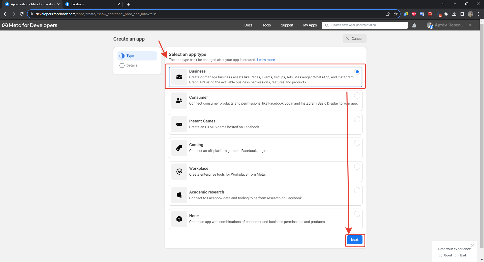 3. In the next "Application Type" window, select "Business" and click on the "Next" button
