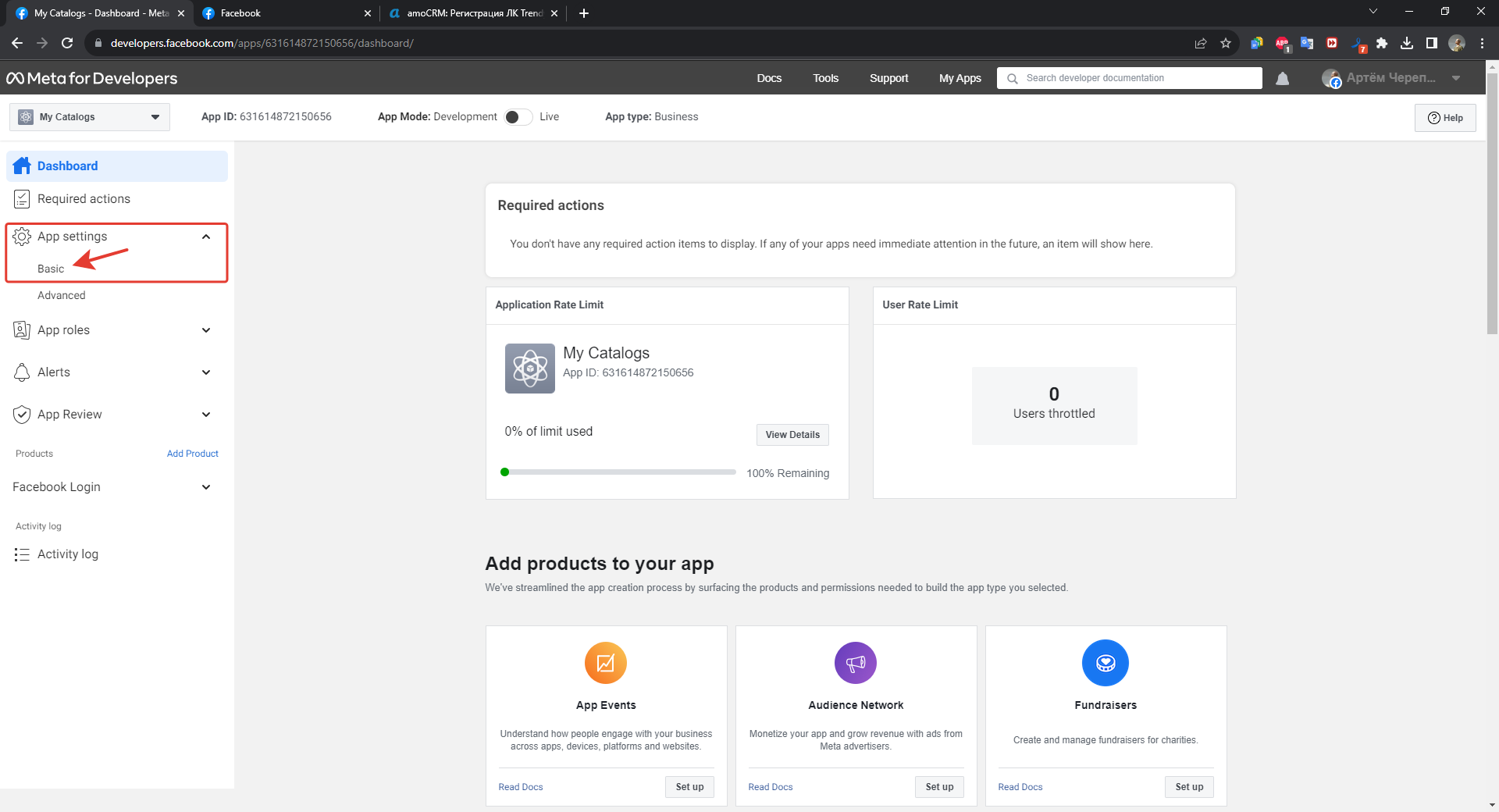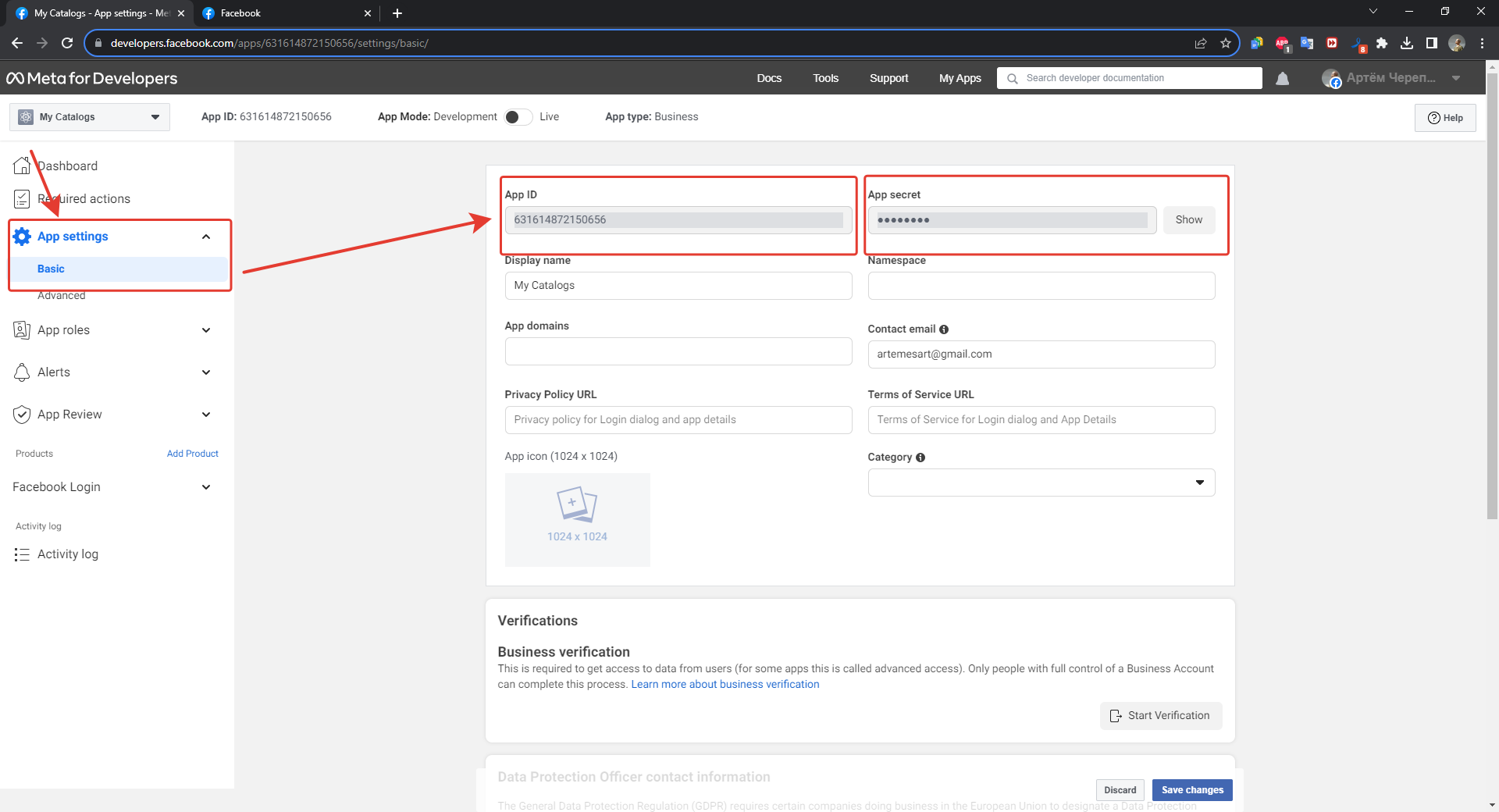1. If you continue with the previous steps - after saving, you should select "Application Settings" on the left panel, "Basic" tab. You need to copy the values from the Application ID and Application Secret fields, to get the latter you need to click on the "Show" button to the right of the field with the secret key. These data are entered into the corresponding fields in the RadistWeb cabinet