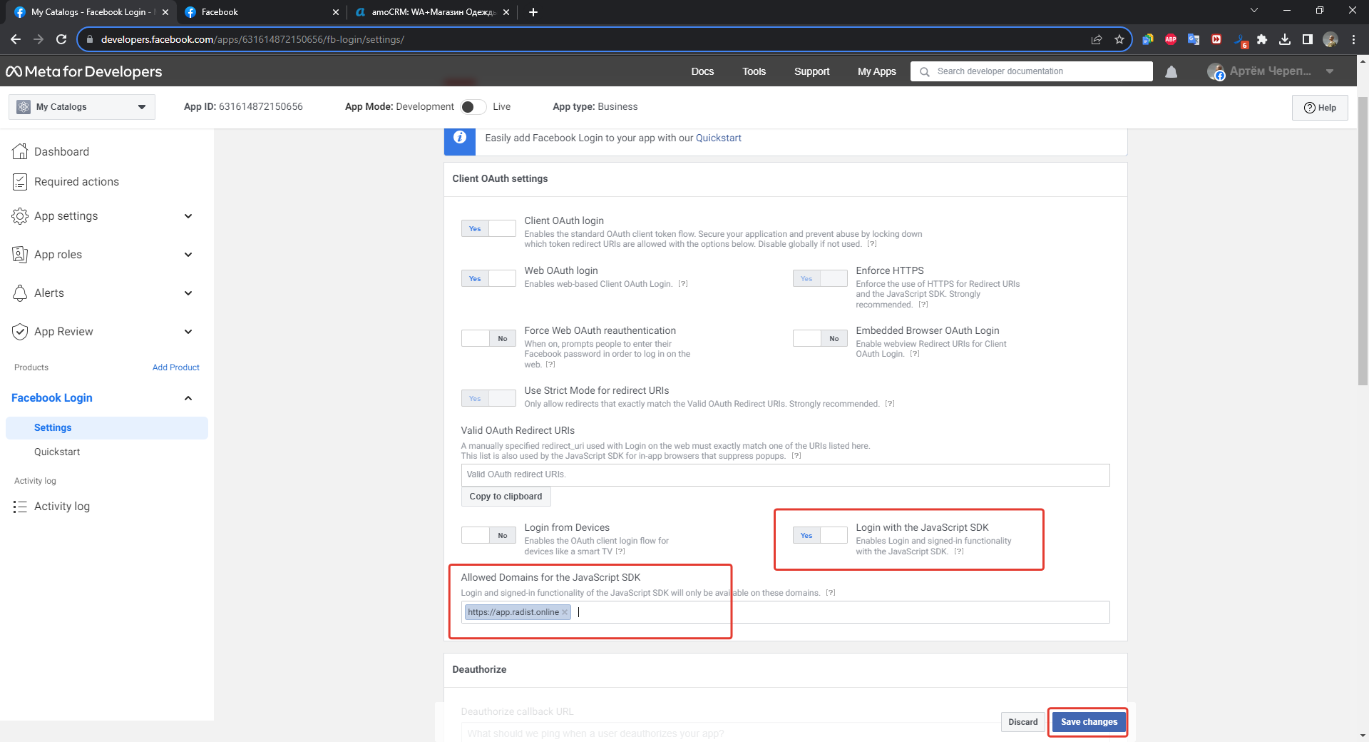 8. After switching to Facebook login\*\* you need to scroll down to the "Client OAuth settings" block and activate the "Login with the JavaScript SDK" switch (you need to move the switch to the "Yes" position), then enter `https://app.radist.online` in the field just below "Allowed Domains for the JavaScript SDK" and save your changes.