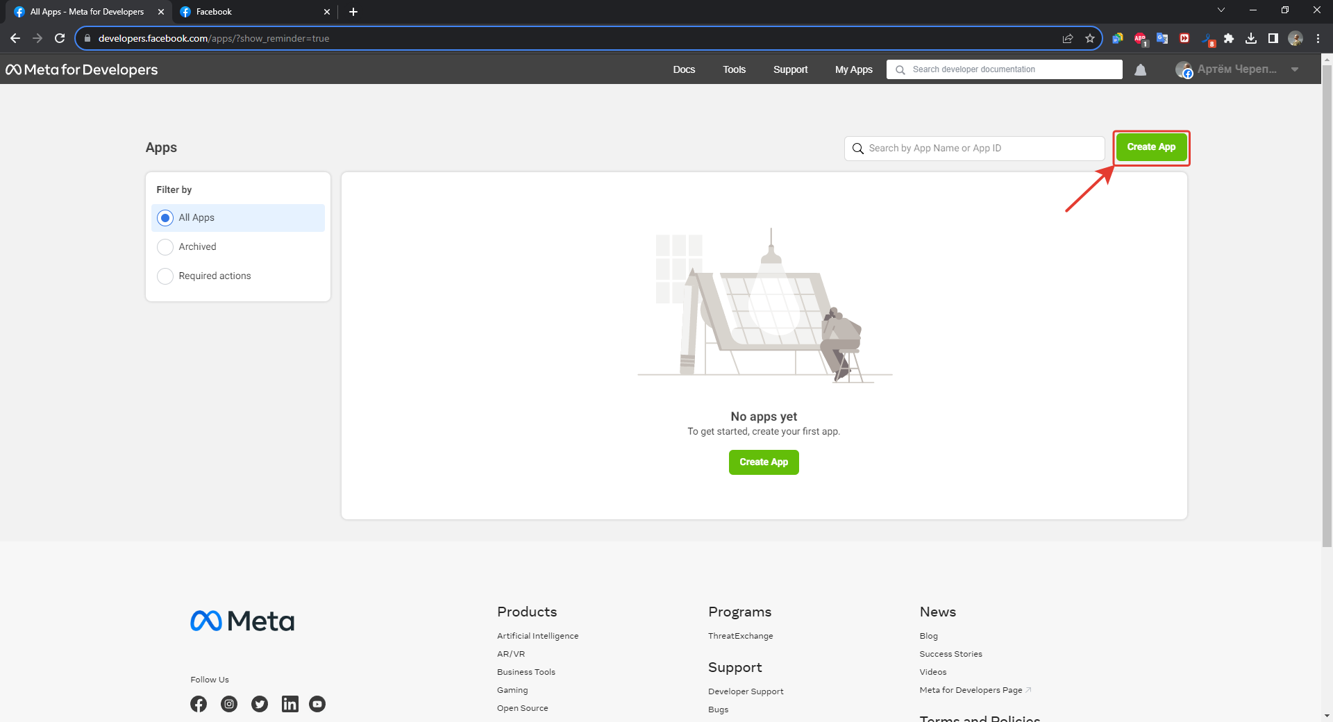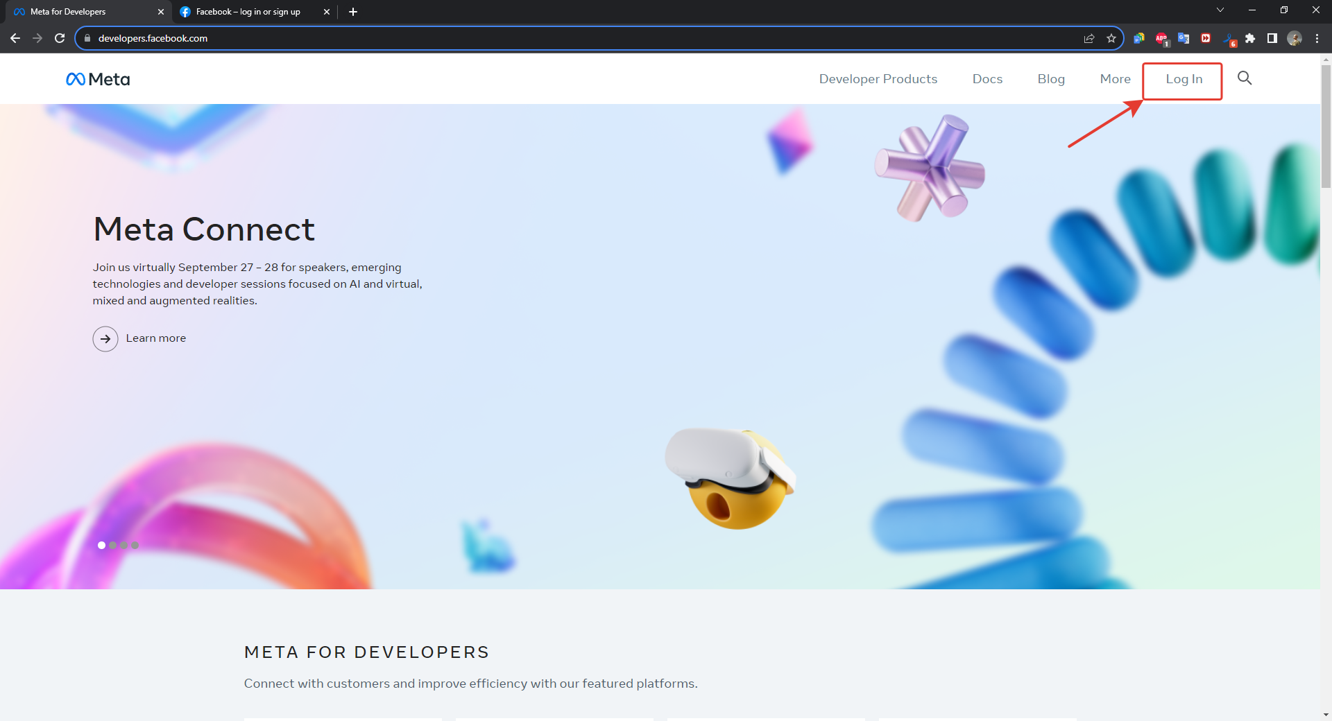 2. The main Meta\* for Developers window will open, in the upper right corner click on the "Log In" button, then you will need to confirm the binding of your account to Meta for Developers