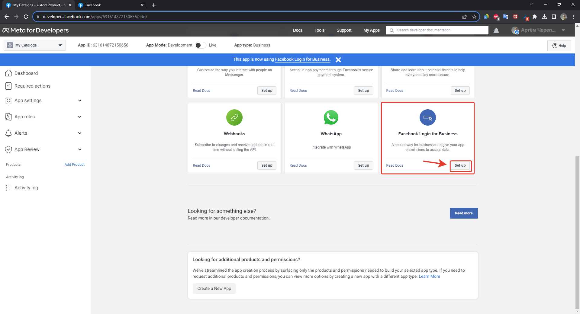 5. A window will open with a list of applications, you need to scroll to the bottom and select "Facebook Login for Business" and click "Set up"