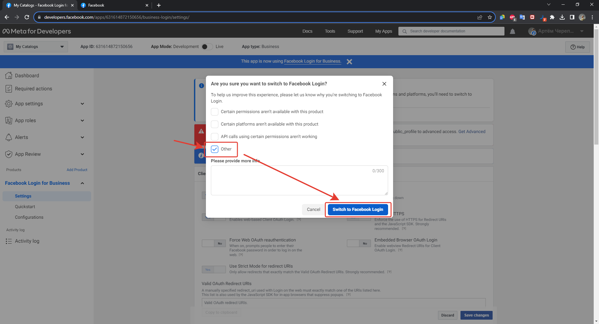 7. A pop-up window will appear where you need to select "Other" and click on "Switch to Facebook Login"