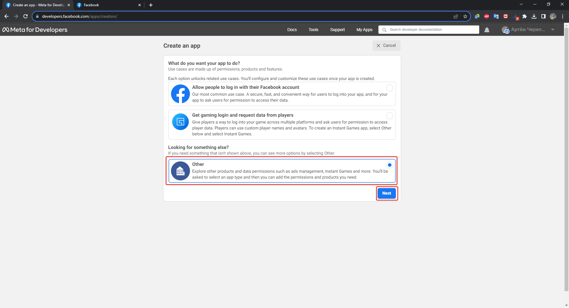 2. A window will open in which you will have to choose from the suggested options what you need the application for. Here, check "Other" and click the "Next" button