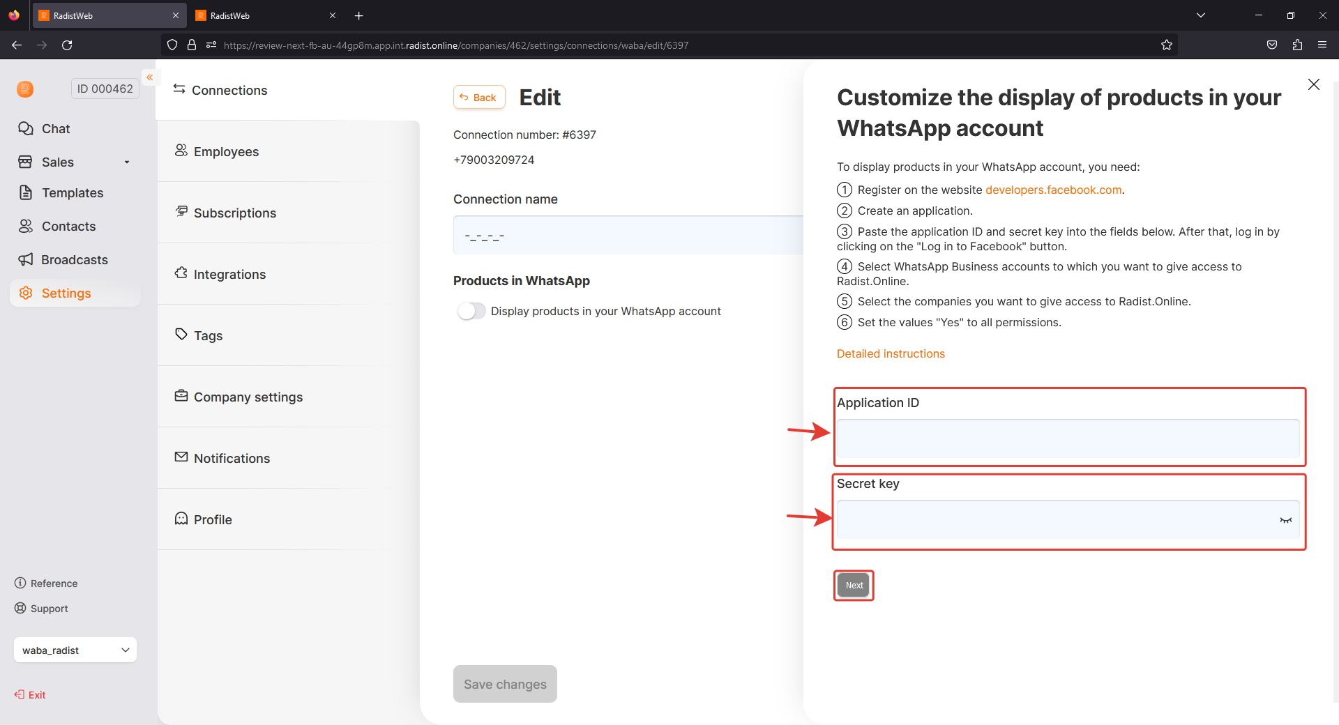 5. Application ID and secret key must be entered when enabling catalogs in the RadistWeb cabinet <https://app.radist.online/> - Settings - Connections - WhatsApp Business API - Edit - Display products in WhatsApp account, click "Next" and log in to Facebook