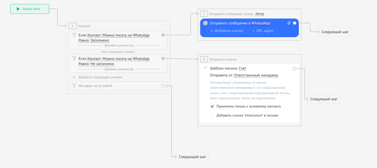 После запуска в salesbot выбрать "Условие" по созданному полю с типом "флаг" в карточке контакта.