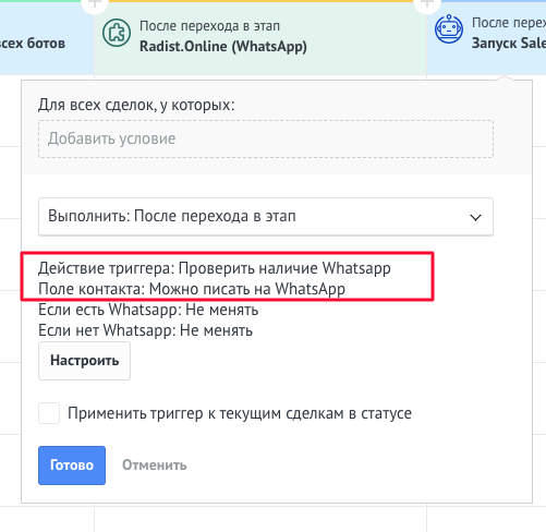 Если номер клиента не зарегистрирован в WhatsApp, то наш специальный триггер может это отследить и выполнить 2 действия: заполнить поле и/или сменить этап сделки.