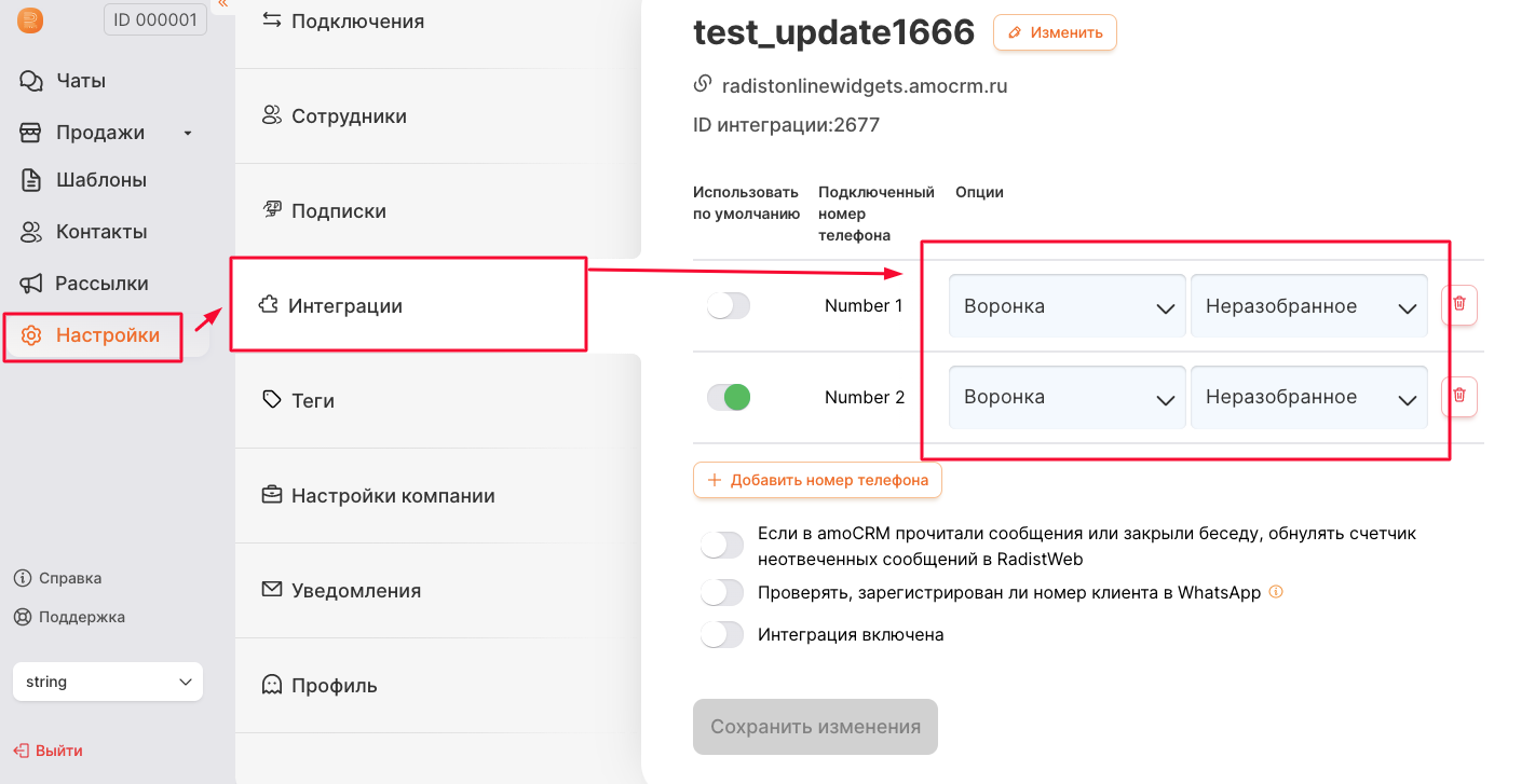 Для каждого номера можно выбрать свою воронку и свой статус.