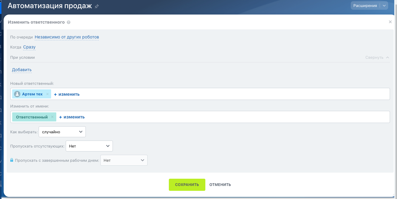 5. ✅ В дальнейшем, при создании или попадании лида на этот этап, автоматически будет осуществляться смена ответственного на соответствующего специалиста.