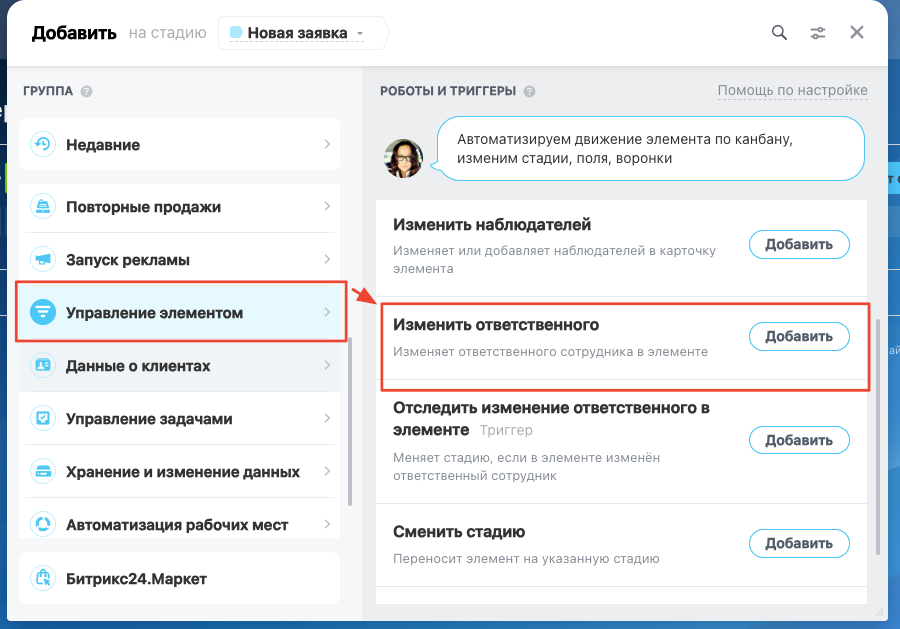 3. В пункте "Управление элементом" добавьте робота **«Сменить ответственного»** <br>