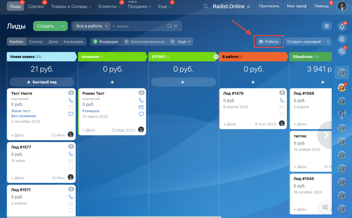 2. Перейдите в **Настройки роботов** на первой стадии лида. <br>