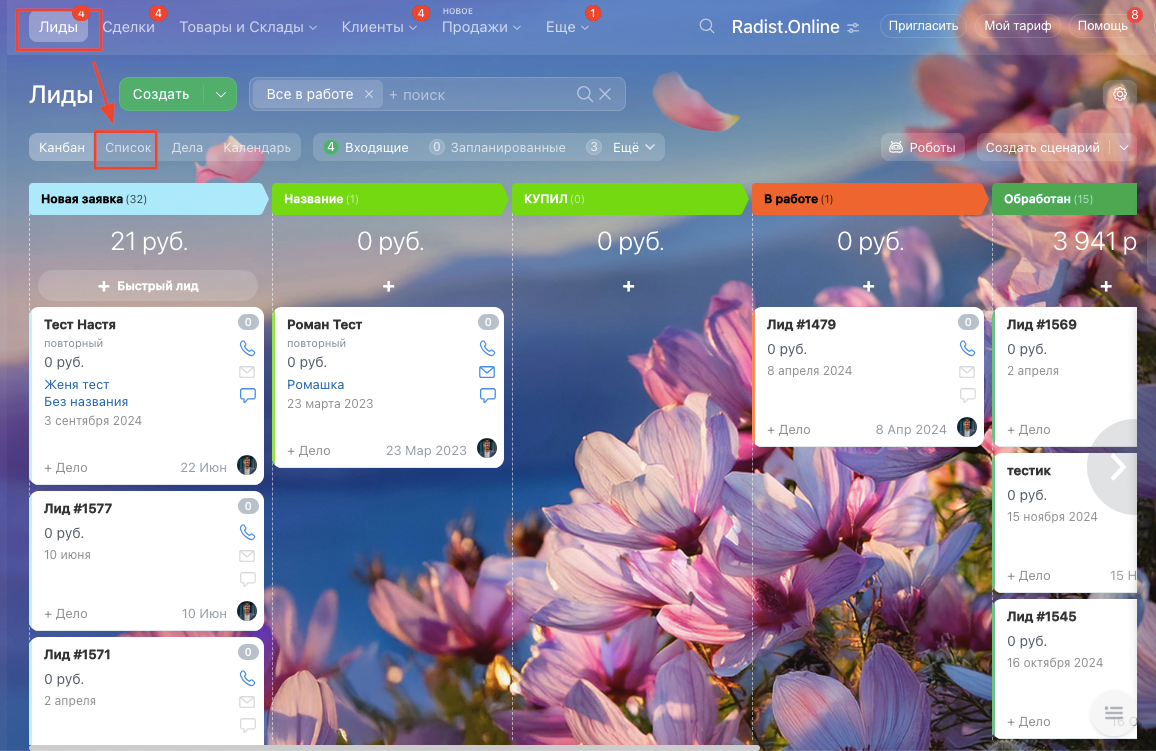 2. Откройте вкладку **Лиды** и выберите режим отображения **«Список»**. <br>