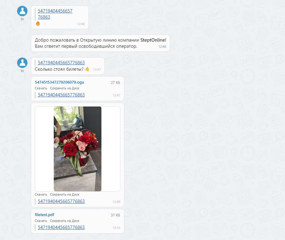 🔟 Подтягиваются сообщения, отправленные с телефона (Telegram), сообщения будут отмечены, как отправленные с телефона.