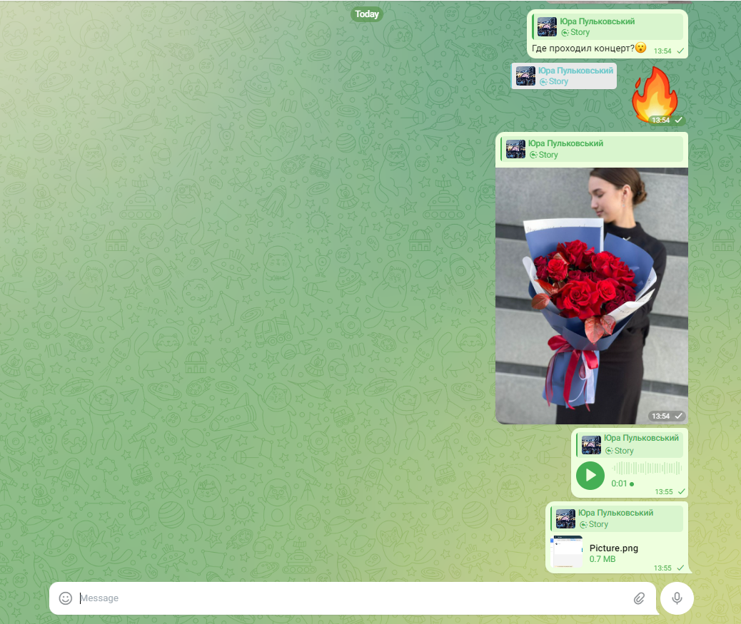 При ответе клиента на сторис в Telegram поддерживаются различные типы сообщений: текстовые, голосовые, документы и видео.&#x20;