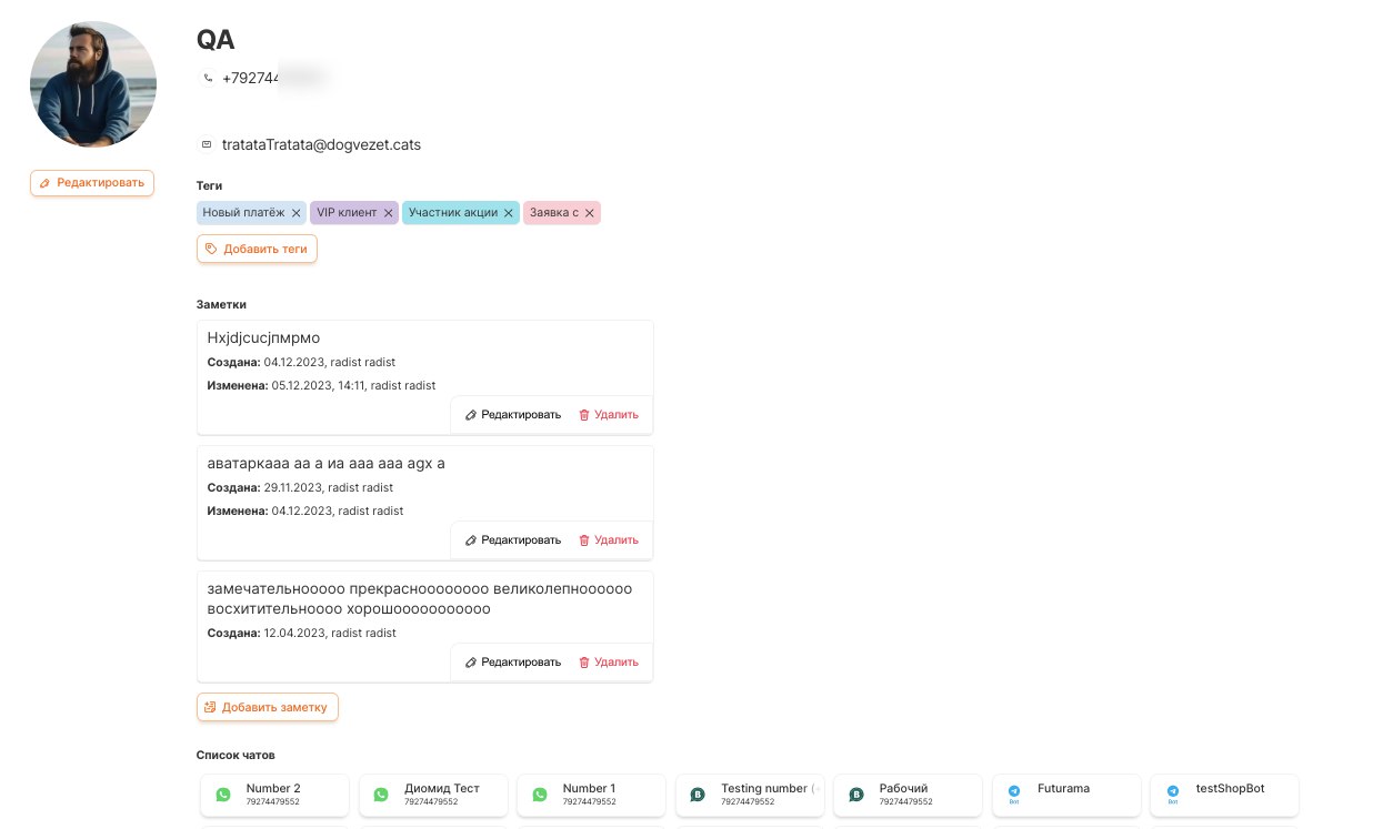 * вести базу контактов, редактировать имена клиентов, номера телефонов, e-mail, добавлять заметки и теги; &#x20;