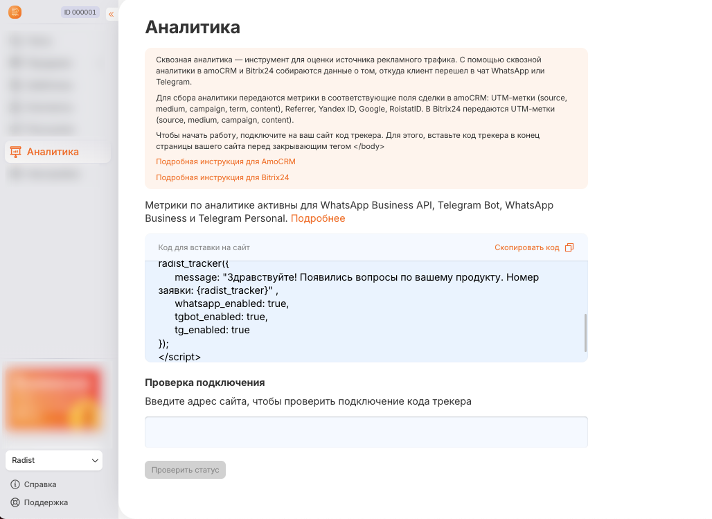 * подключать наши интеграции с CRM-системами: amoCRM и Битрикс24, при этом исходящие из RadistWeb сообщения будут отображаться в чатах crm-систем;&#x20;