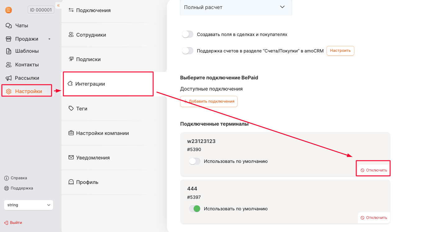 # Отключение интеграции Банк+amoCRM  в ЛК