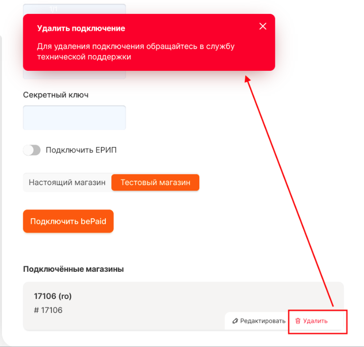 С концами удалить магазин из ЛК в разделе "Подключения" можно через нашу тех поддержку. &#x20;