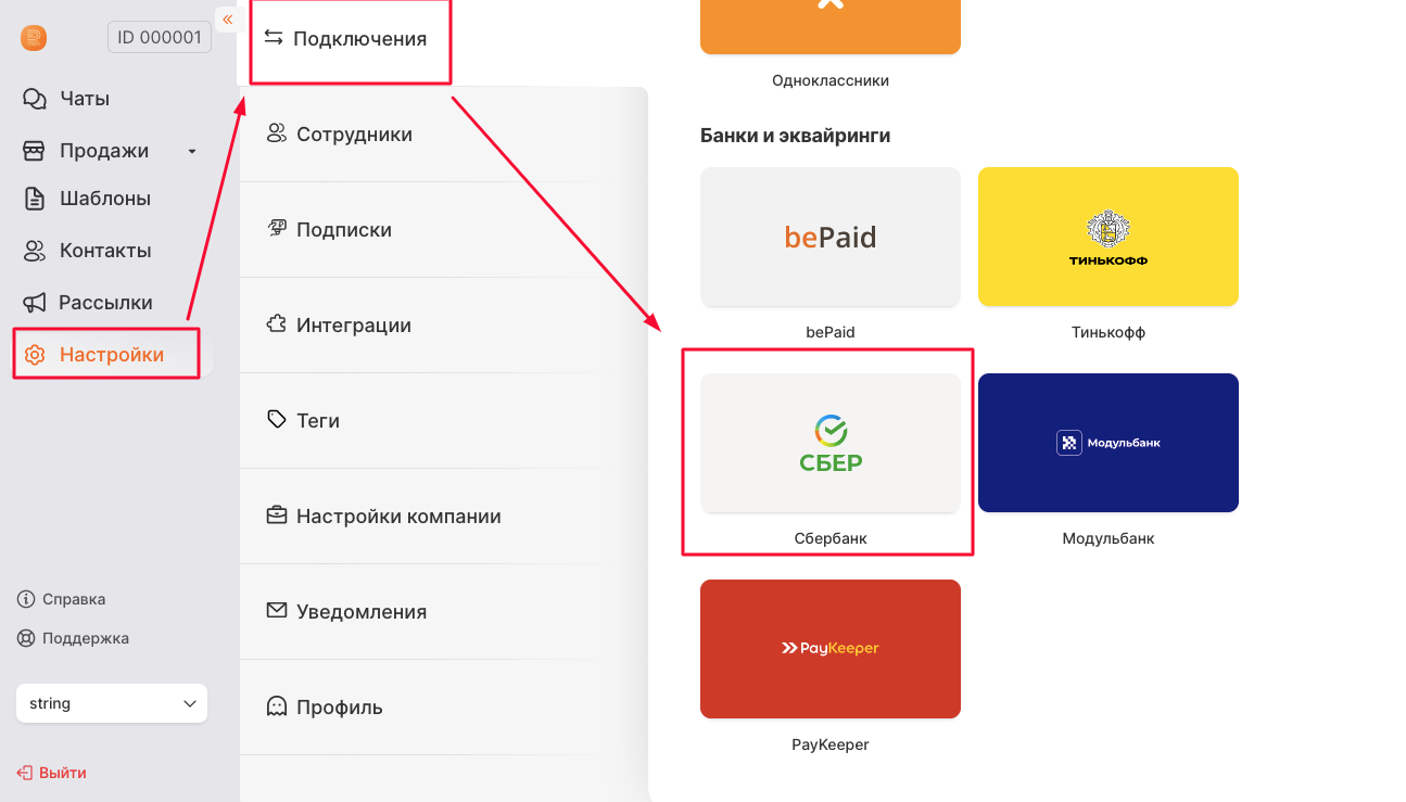 4) Перейти в в наш ЛК --> Настройки --> Подключения --> Выбрать Сбербанк
