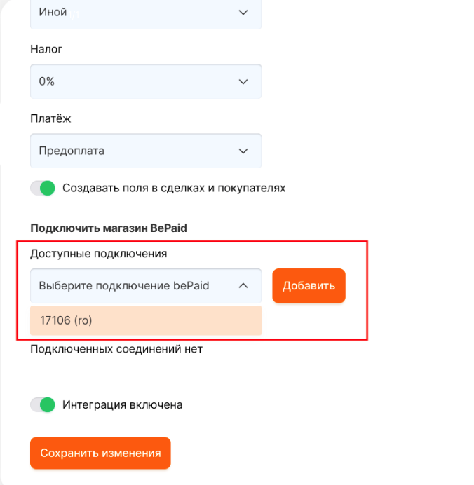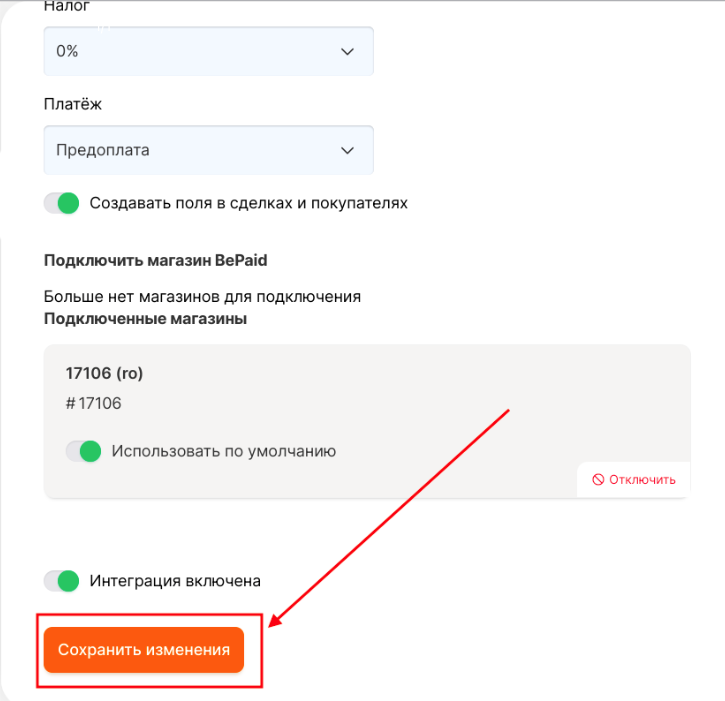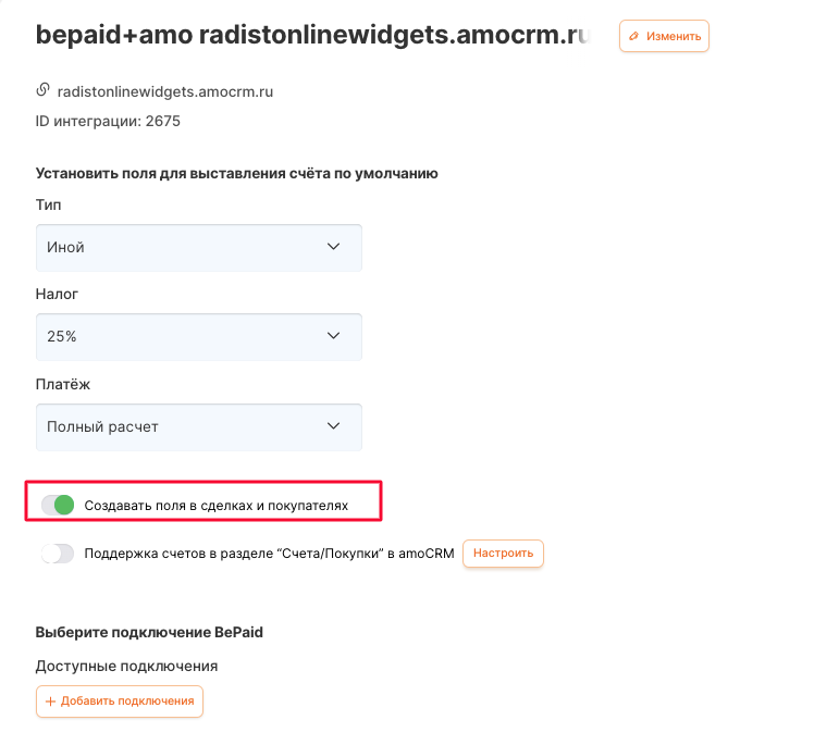 Для того, чтобы автоматически в амоСРМ создались поля bepaid\_amount, bepaid\_link, bepaid\_order в сделках  и покупателях включите тумблер. &#x20;