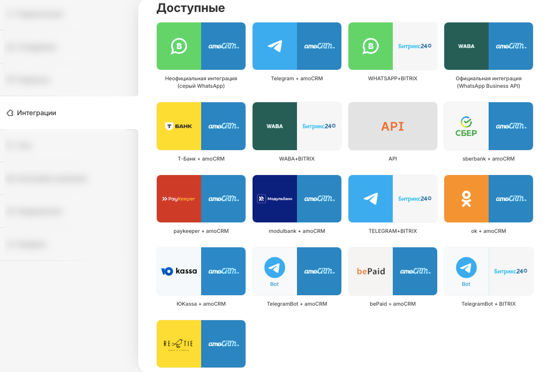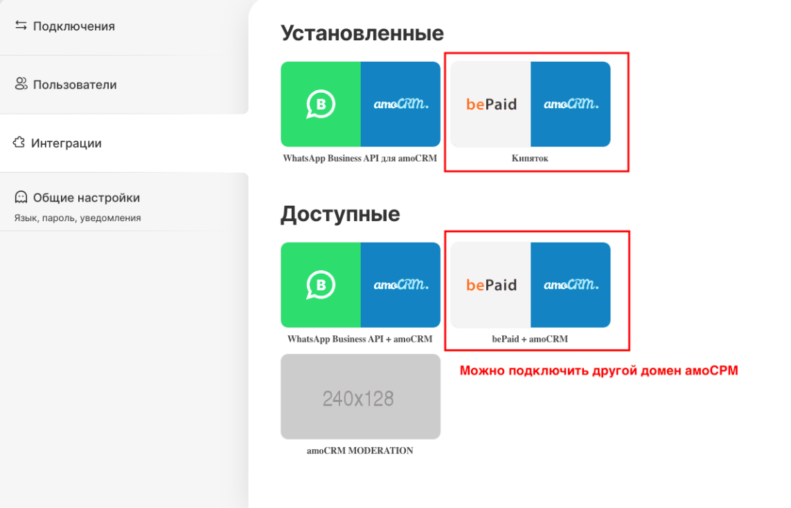 ‌В категории "Доступно" интеграция также остается, так как при необходимости вы сможете подключить интеграцию с другим доменом amoCRM. &#x20;