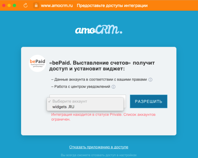 Если кабинет в амоСРМ у вас уже авторизован, то система предложит выбрать аккаунт, к которому нужно подключить интеграцию.  ‌&#x20;
