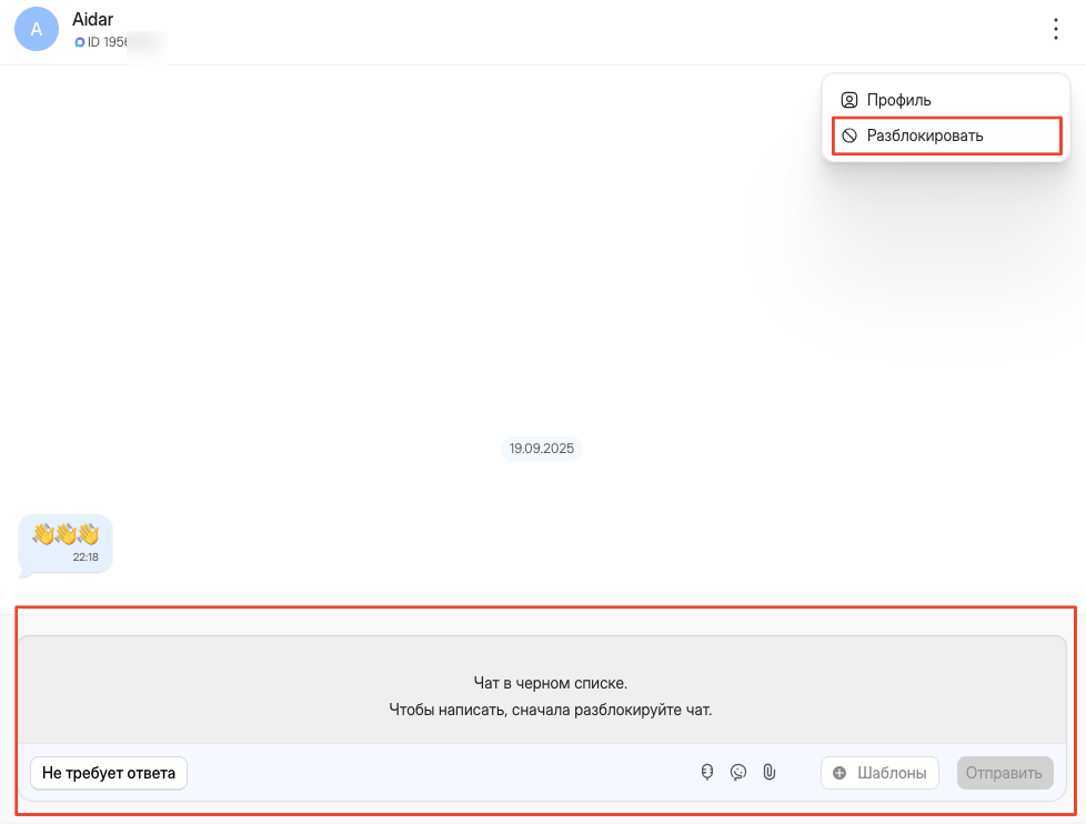 * В карточке можно **только разблокировать чат** (заблокировать из этого раздела нельзя).