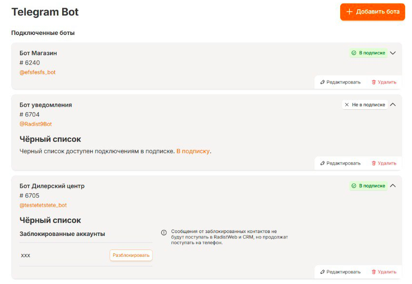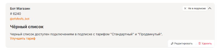 Для подключений Telegram Bot, а также для WhatsApp и WABA, предусмотрены заглушки отображения черного списка. Они активируются, если подключение не находится в подписке или оплата за подключение не произведена: