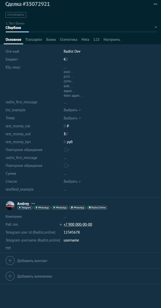 * &#x20;Интеграция с AmoCRM — [подробнее (нажмите, чтобы перейти)](https://docs.radist.online/radist.online-docs/nashi-produkty/radist-web/integracii/telegrambot+amocrm)