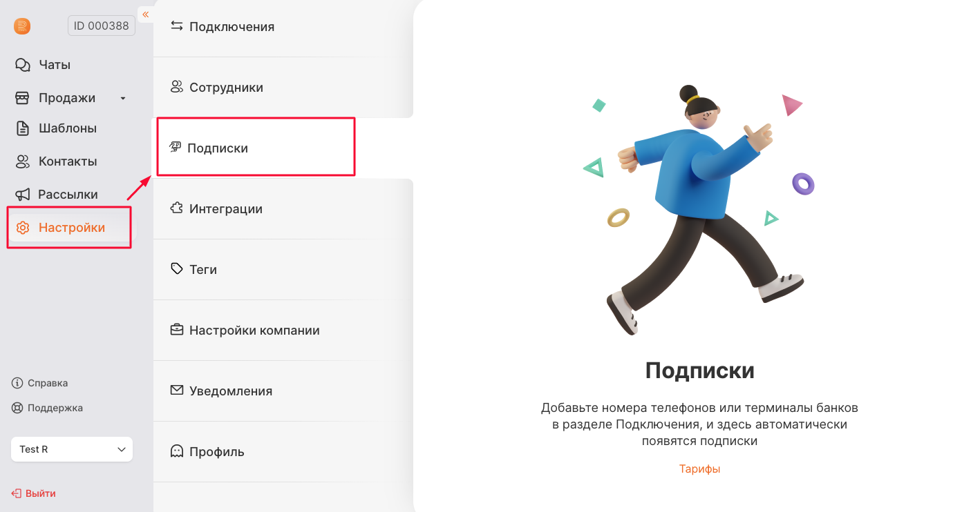 * Подписка создается, только тогда, когда подключен какой-либо тип подключения в личном кабинете в разделе “Настройки” - “Подключения” (т.е если добавлен номер телефона, группа, терминал от банка и т.д)