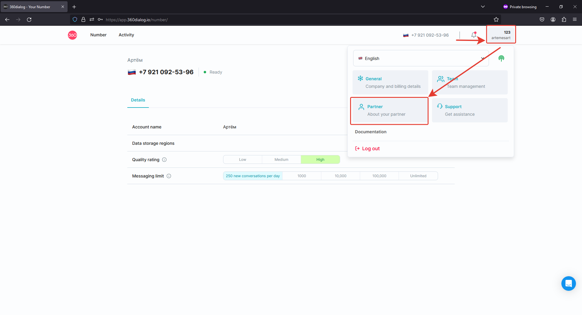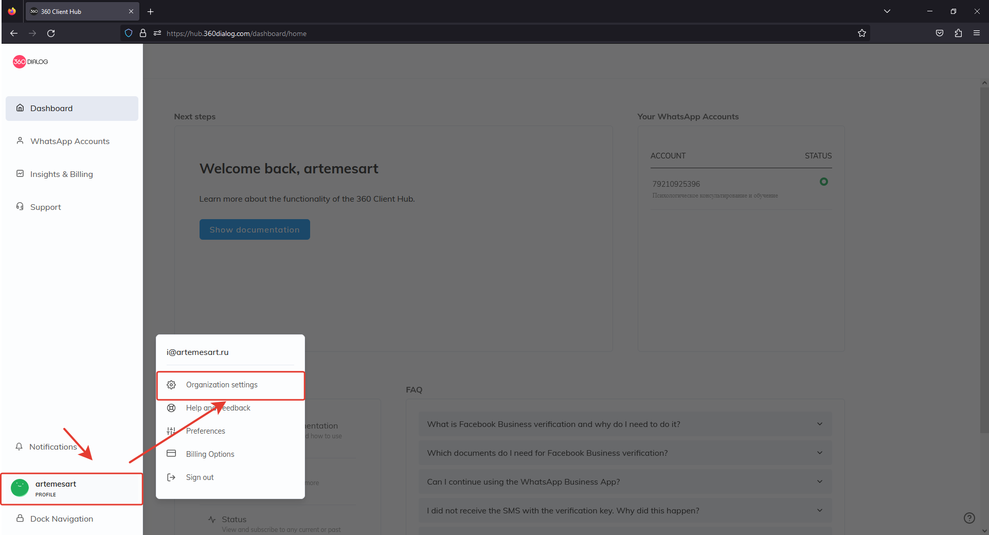 1. В вашем кабинете 360Dialog перейти в **Profile-Organization Settings** в левом нижнем углу (рис.1) либо если у вас новая версия кабинета 360Dialog- в правом верхнем углу **Profile - Partner**(рис.2)