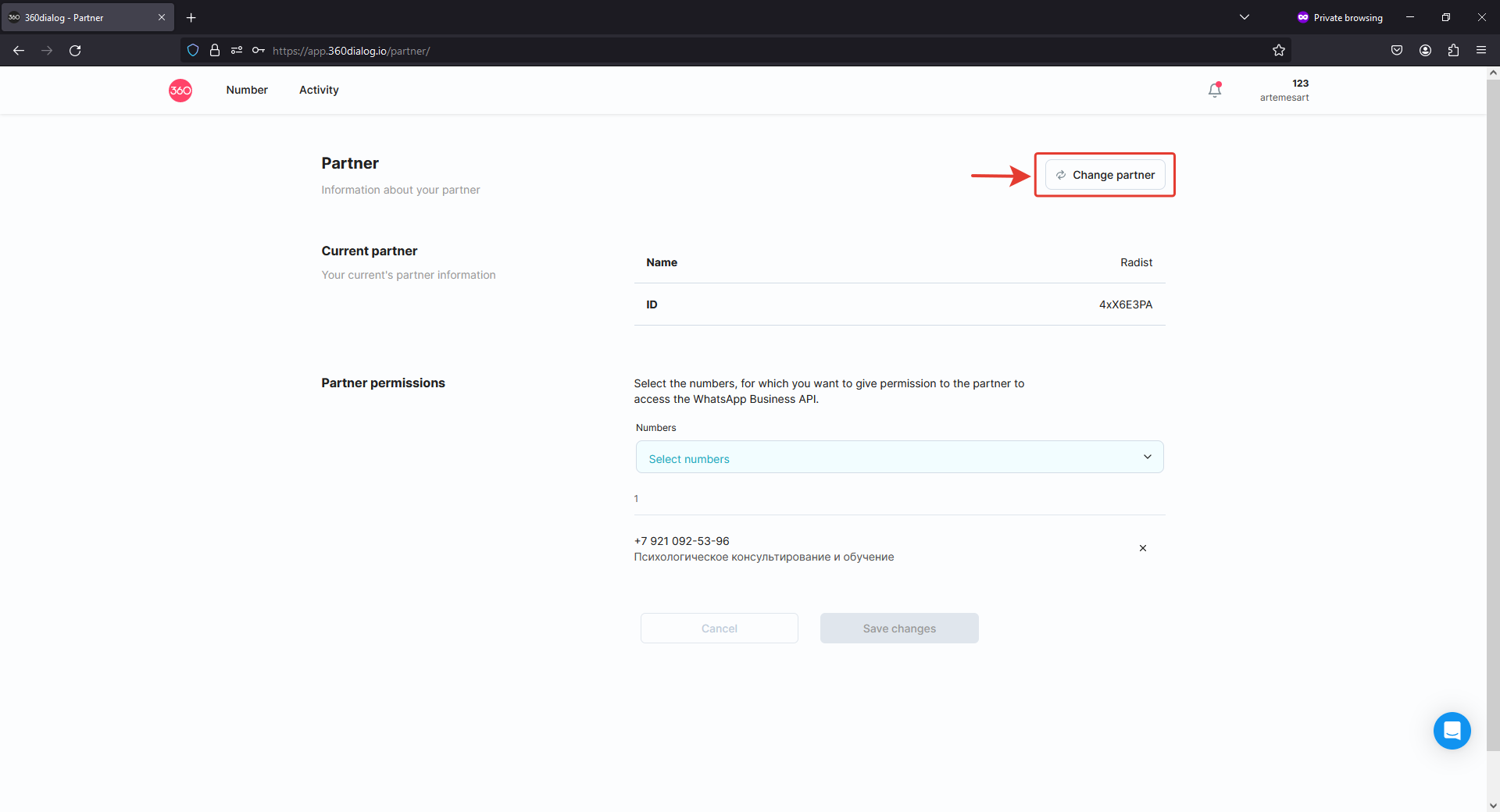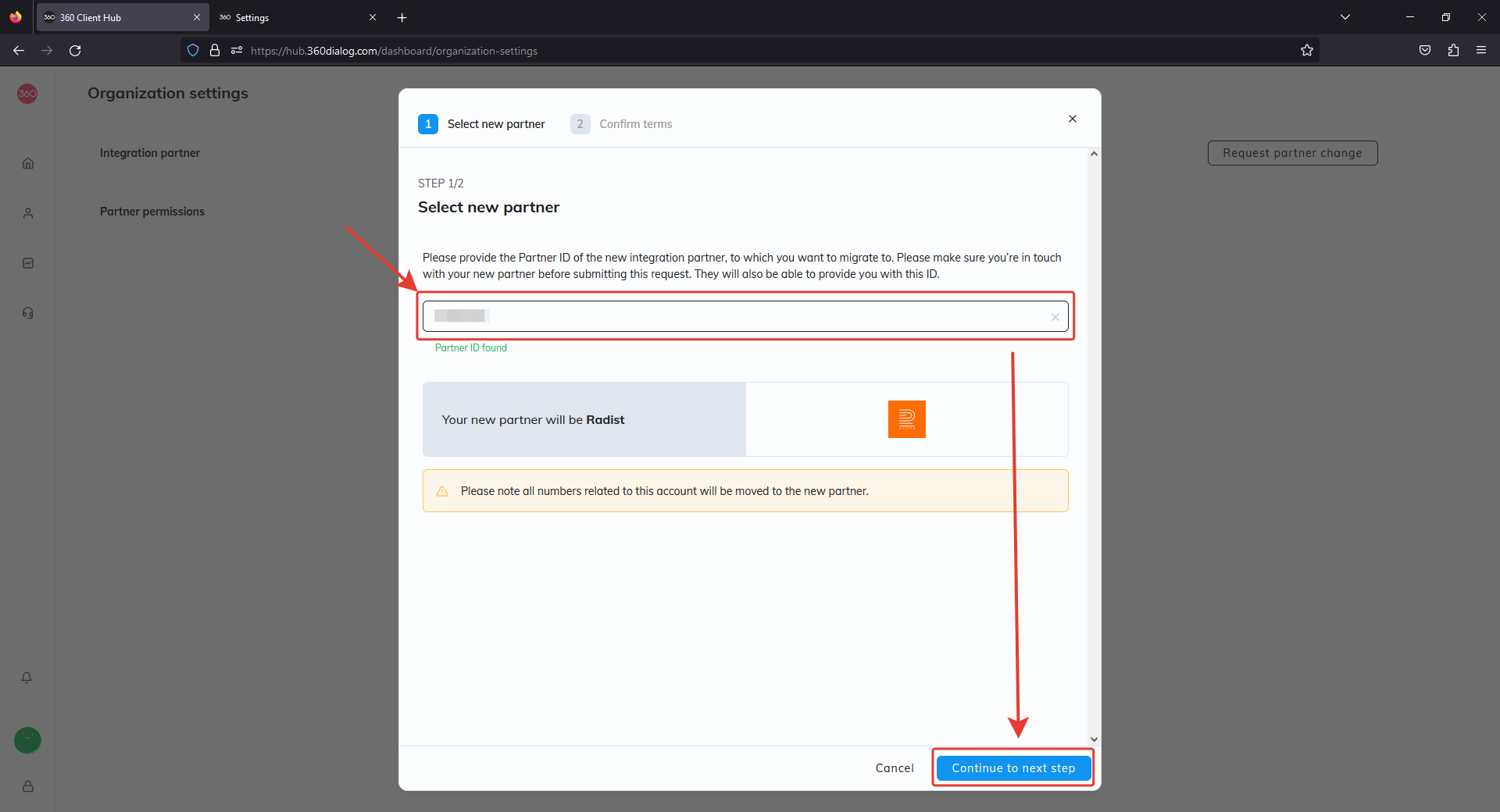 3. После нажатия на кнопку смены партнёра откроется окно, в котором нужно ввести наш **промокод**. Он должен прийти вам в сообщении с инструкцией по миграции, если нет - напишите, пожалуйста, нам в техническую поддержку - поможем. Если промокод введён правильно - чуть ниже поля будет сообщение **Partner ID found** зеленого цвета. В новом кабинете **360Dialog** форма ввода промокода полностью идентична.