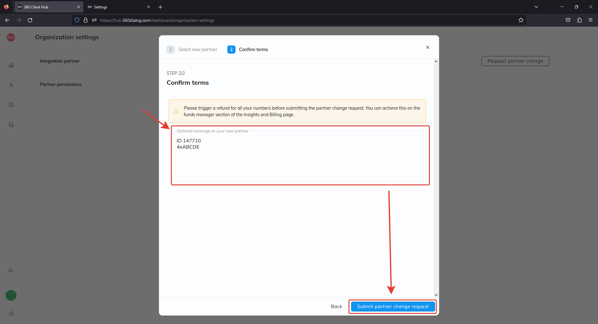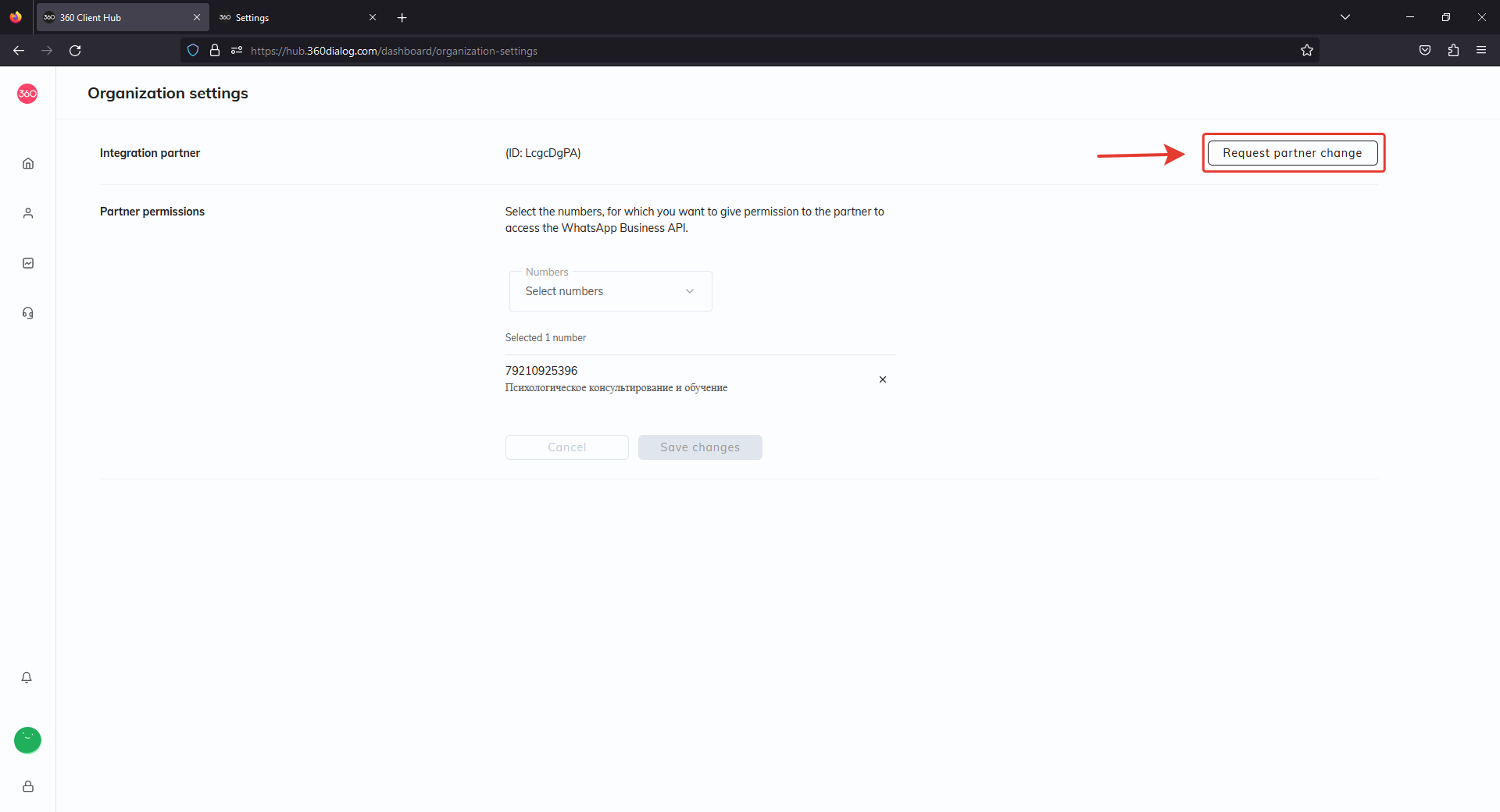 Этот метод подойдёт если миграция происходит внутри 360Dialog из другой компании-партнера, либо если вы меняете способ оплаты.