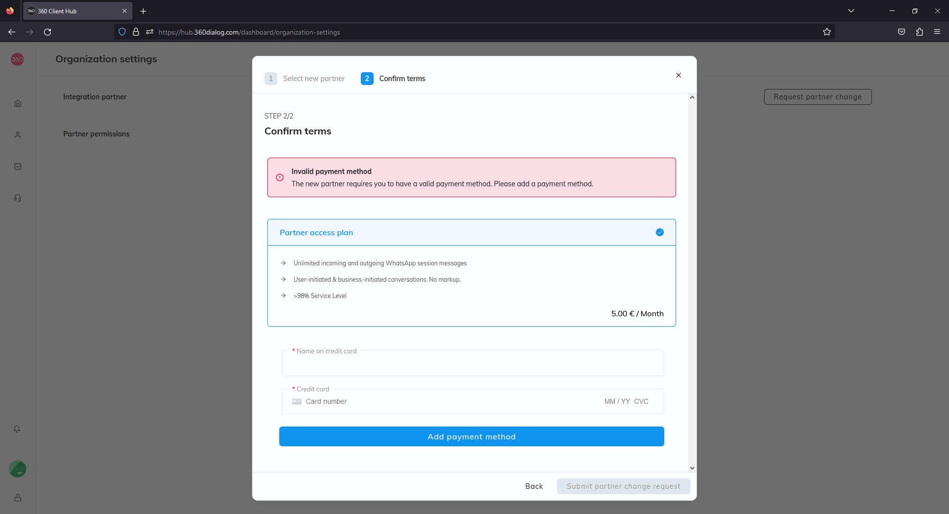 <figure><img src="https://2086500725-files.gitbook.io/~/files/v0/b/gitbook-x-prod.appspot.com/o/spaces%2F-MXlY6zVfZf9OqBmsNV0%2Fuploads%2FrDGSyNaEmkA2DsUebCYv%2F1.3.1%20billing.png?alt=media&#x26;token=0194bd8d-2004-48ee-a661-c72307f5b131" alt=""><figcaption><p>Рис.6 Окно ввода платежных данных. (Для оплаты напрямую в 360Dialog)</p></figcaption></figure>