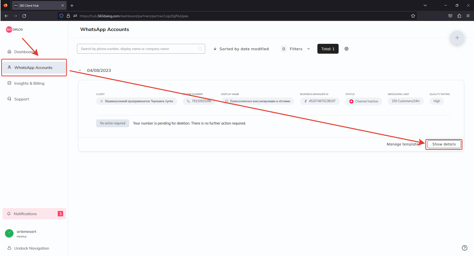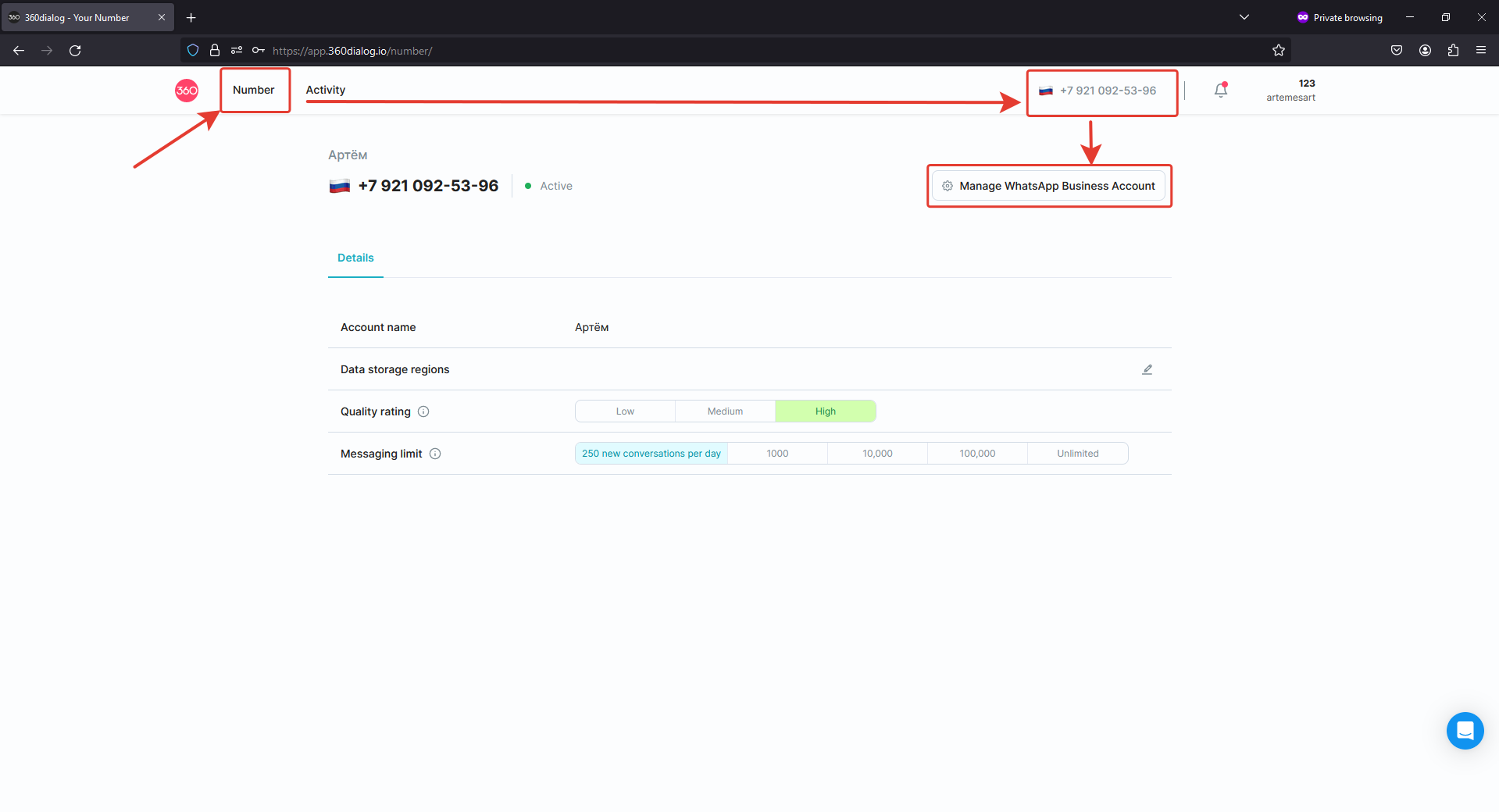1. Интерфейсы кабинетов отличаются, если у вас классический кабинет - нужно выбрать на левой панели WhatsApp Accounts и нажать Show Details  (Рис.1), либо, если новая версия кабинета 360Dialog, то на верхней панели - Number, выбрать нужный номер в правой части и нажать на кнопку Manage WhatsApp Business Account (Рис.2).