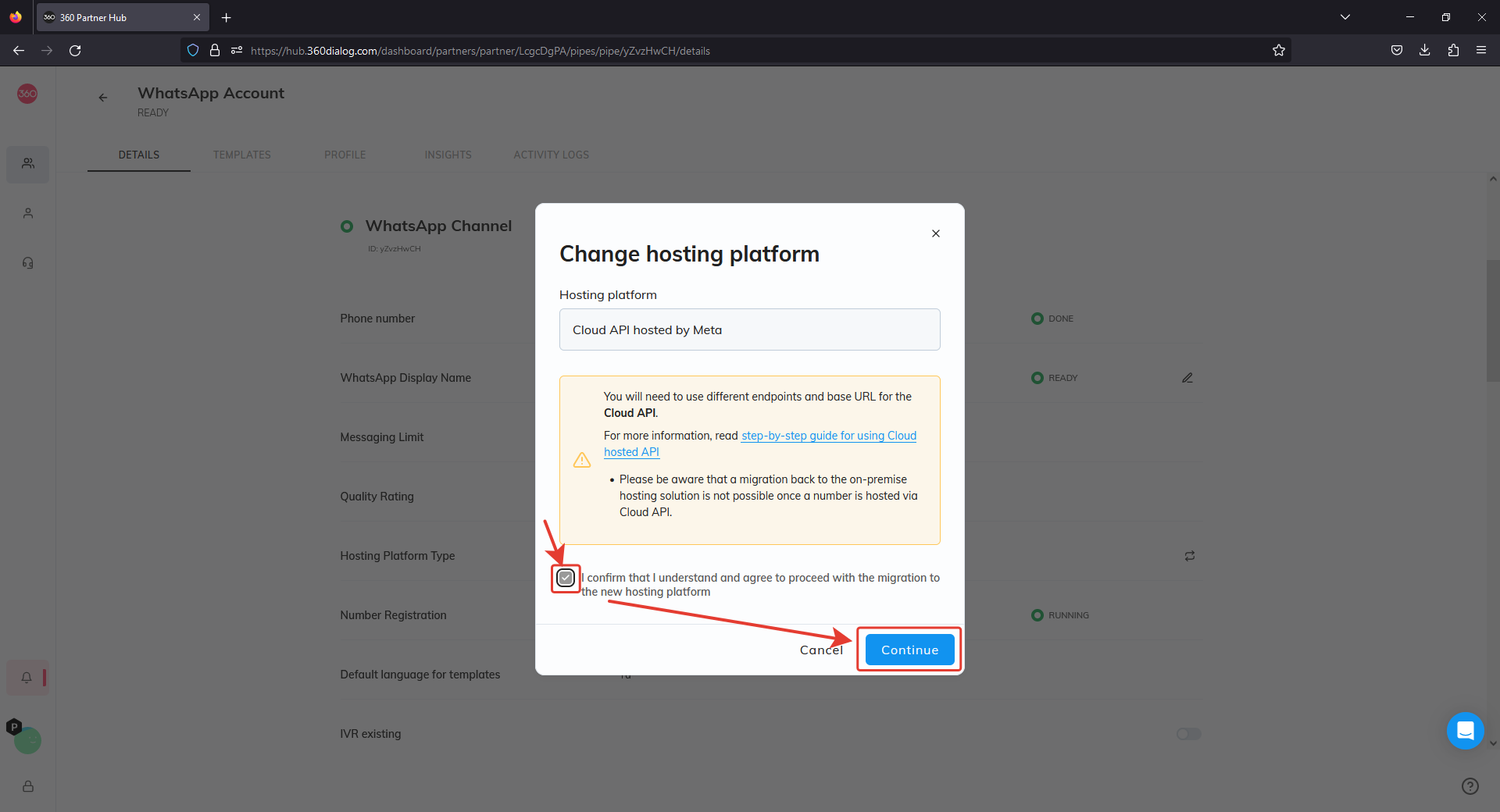 5. Система предупредит о том, что нужно подождать 3 минуты и номер перейдёт на CloudAPI, появится зеленое сообщение об успешной миграции, данные в поле Hosting Platform Type изменятся на Cloud API hosted by Meta. Миграция прошла успешно.\