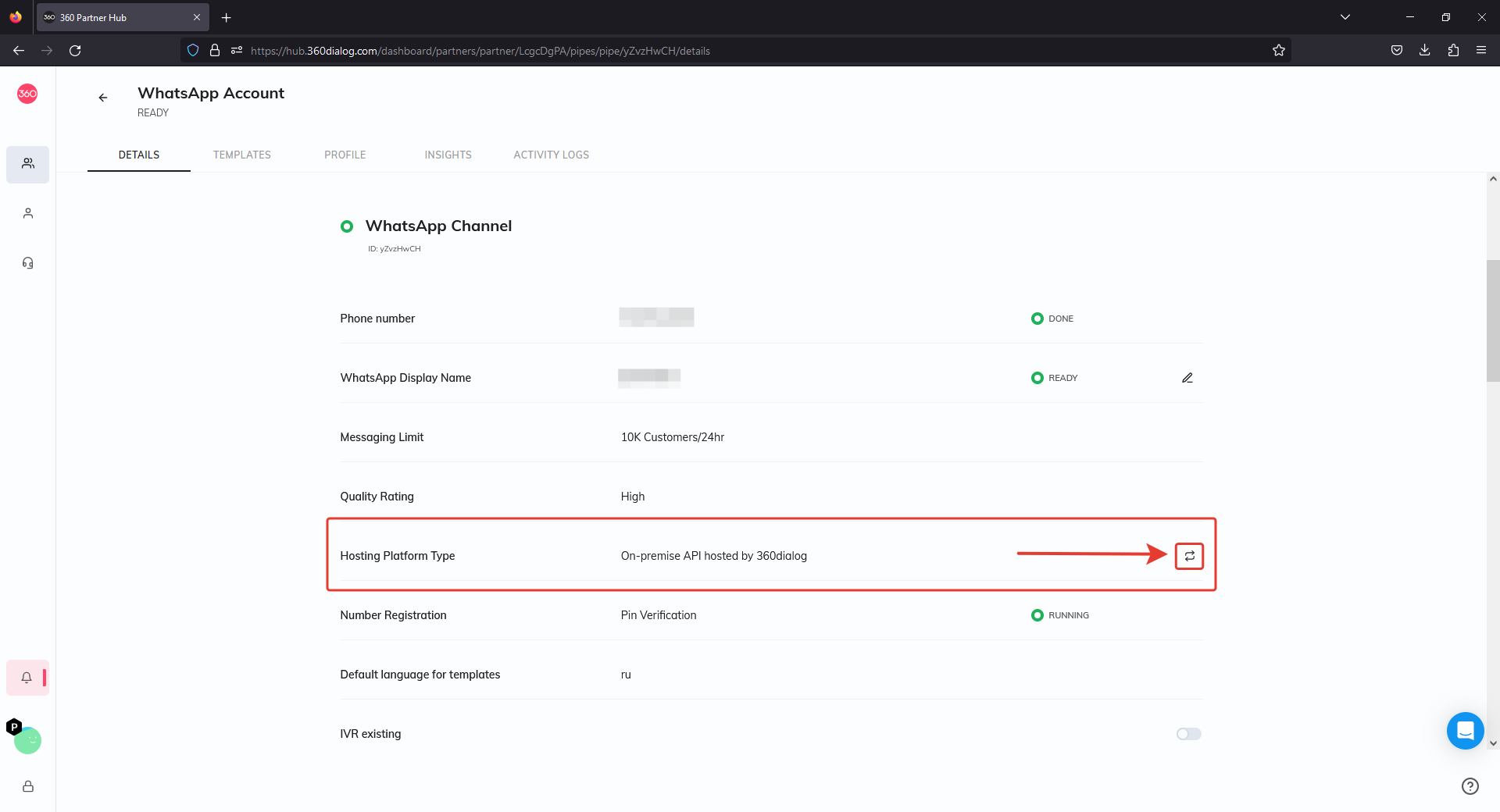 2. В открывшейся информации о номере нужно найти раздел WhatsApp Channel и в нем поле Hosting Platform Type, если в нем стоит значение On-premise API hosted by 360dialog (Рис.3) - это значит что номер находится на серверах 360Dialog и его можно мигрировать в CloudAPI. Для этого нужно нажать кнопку справа от типа хостинга