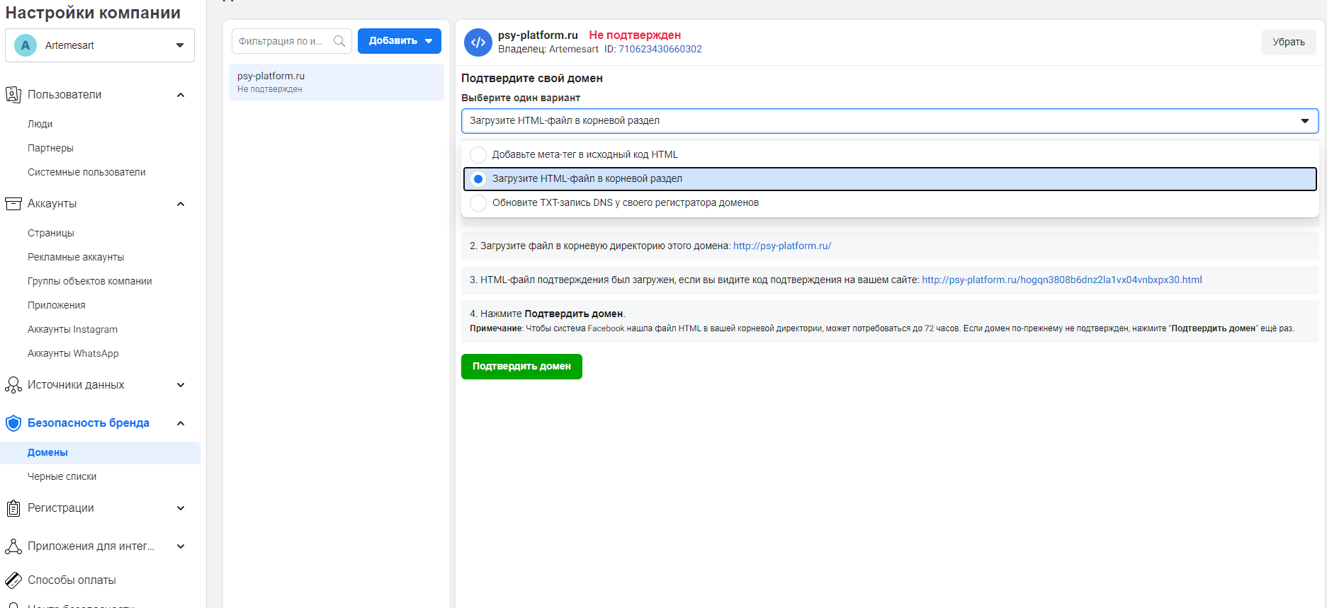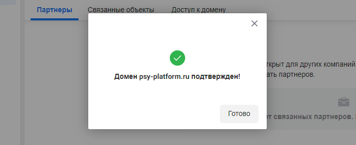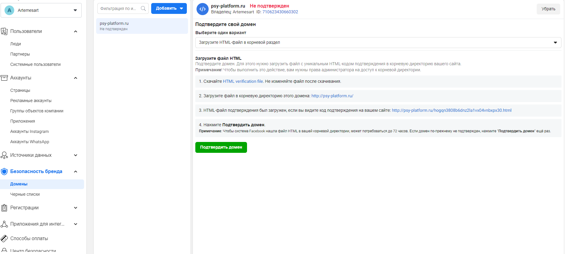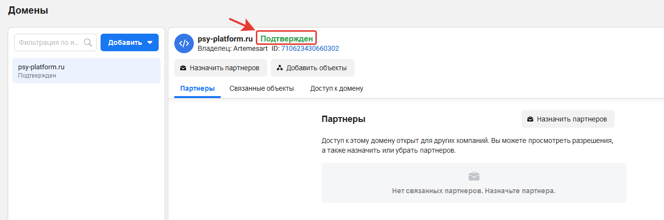 В разделе "Безопасность бренда - Домены" возле адреса будет зеленая надпись "Подтвержден"