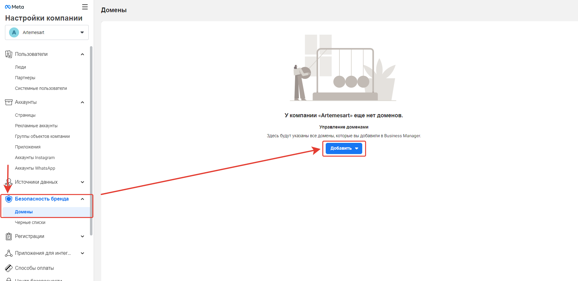 Чтобы добавить домен перейдите в FBM - Безопасность бренда - Домены https://business.facebook.com/settings/owned-domains/
