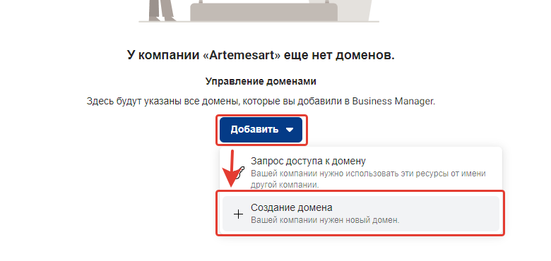 В кнопке "Добавить" выбрать "создание домена" и ввести доменное имя, которое указано у вас в "Информации о компании".