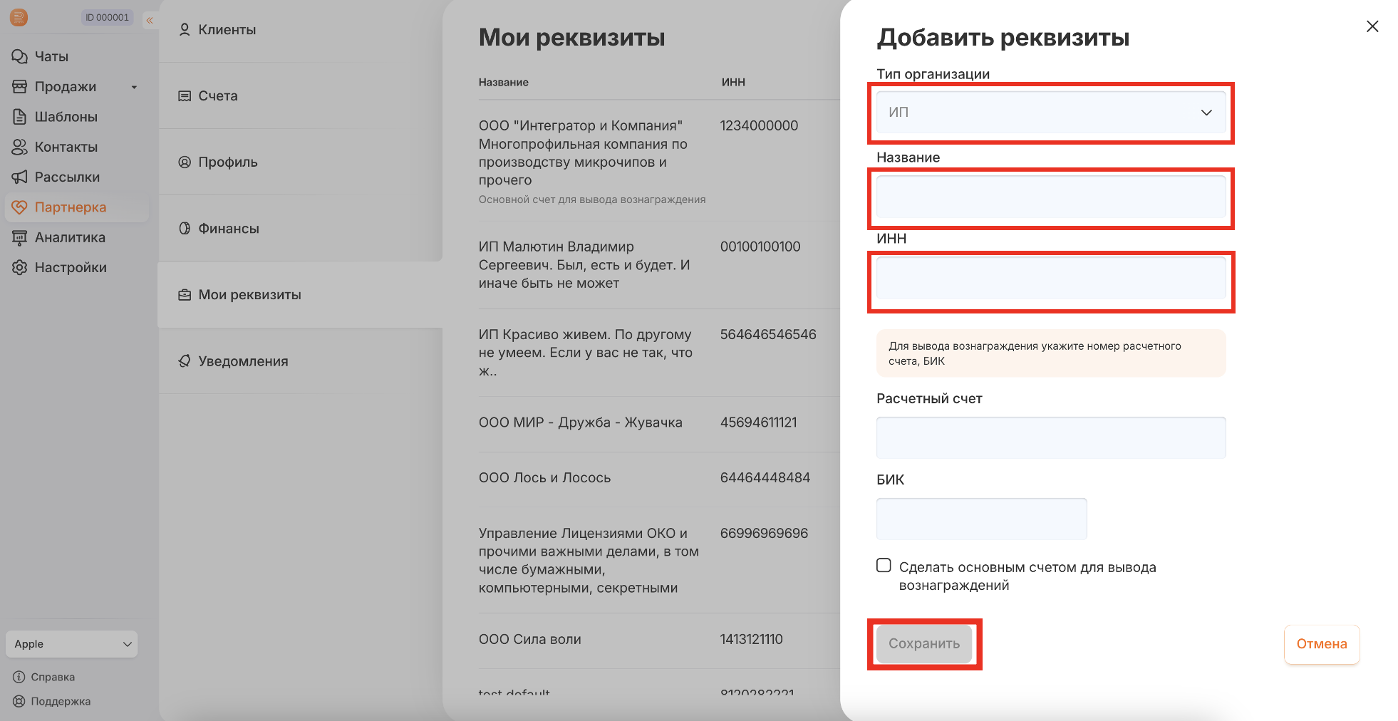 Для оформления счета с партнерским вознаграждением,  необходимо будет отметить реквизиты партнера, на которые счет будет выставлен.