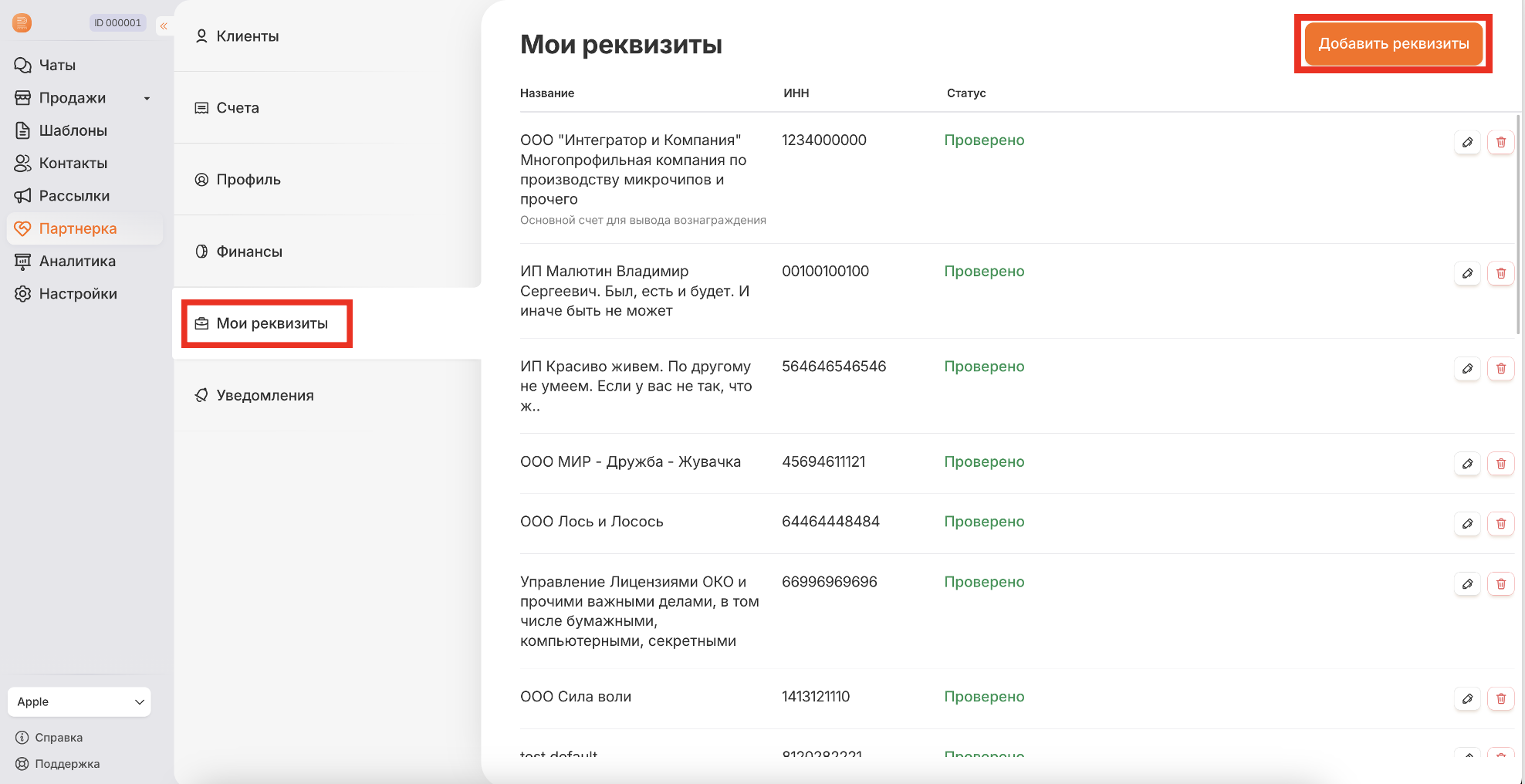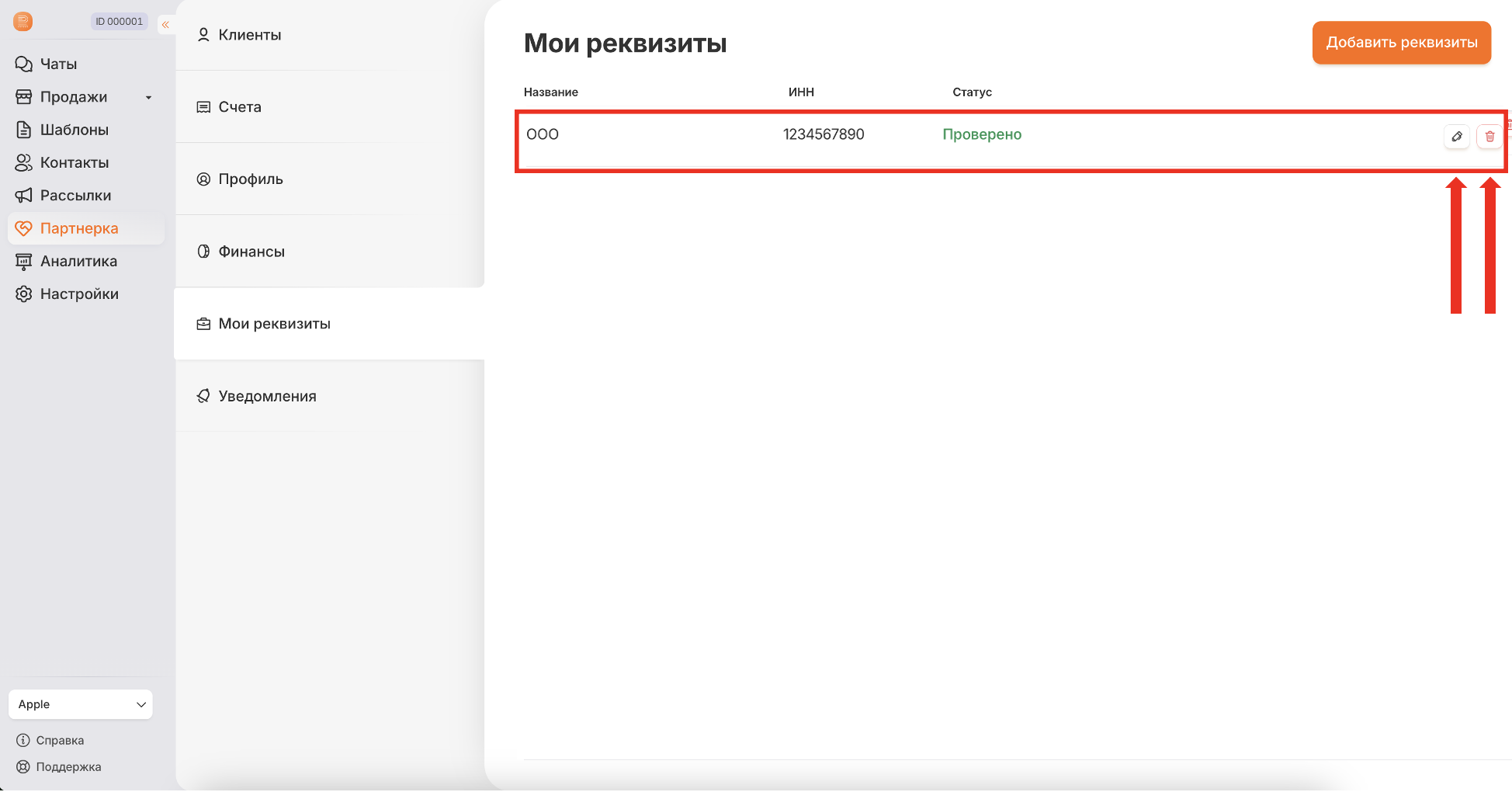 В списке реквизитов в модуле "Партнерка" отображаются только реквизиты, созданные партнером - партнерские - для выставления счета уже с вычетом партнерского вознаграждения.