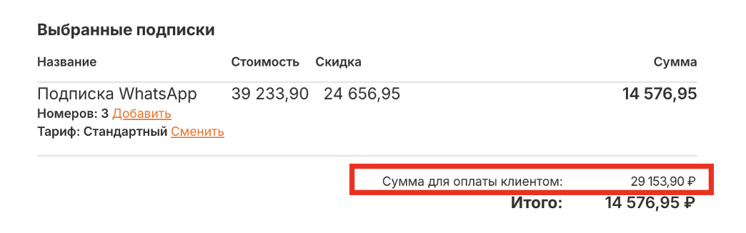 2. **Выбранные подписки** - тут отображаются все подписки выбранные для формирования счета, в этом же разделе вы можете увеличить количество подключенных номером и выбрать тариф для апгрейда, сумма рассчитается автоматически, изменения в тарифе произойдет после зачисления оплаты.\