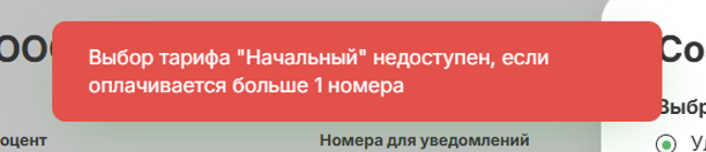 Для перехода на пониженный тариф, например Начальный, прежде чем производить оплату необходимо уменьшить количество номеров в подписке до разрешенных - 1 , если это заранее не сделать система выдаст соответствующую ошибку и не позволит выставить счет:
